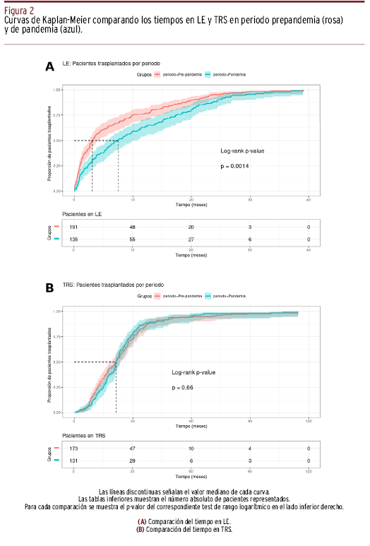 Se definieron dos periodos: prepandémico (2017-2020) y pandémico (2020-2022). Los datos fueron extraídos de la base del hospital, excluyendo trasplantes de donantes vivos o combinados. Se aplicaron análisis estadísticos, como Kaplan-Meier y modelos de regresión de Cox.