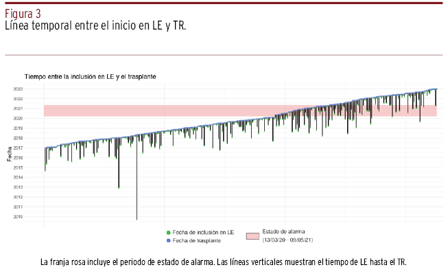 el trasplante renal la opción más eficaz. La pandemia de la COVID-19 tuvo un impacto significativo, reduciendo la actividad de trasplantes y prolongando los tiempos de espera. Este estudio evaluó las diferencias en la actividad de trasplante renal, los tiempos en lista de espera y el tratamiento sustitutivo renal entre los periodos prepandémico y pandémico.