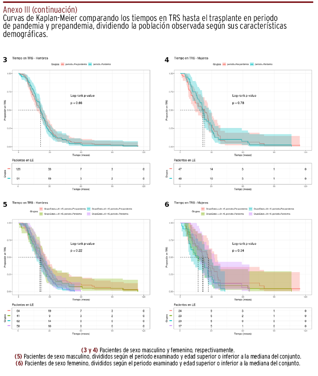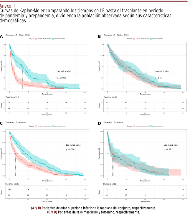 RESULTADOS // El tiempo mediano en la lista de espera aumentó de 3 meses en el periodo prepandémico a 7,5 meses en el pandémico (p=0,0014). La densidad de trasplantes disminuyó de 5,02 casos por mes a 4,21. Los donantes en asistolia aumentaron del 15,1% al 34,8%. Los varones mayores de 61,9 años fueron el grupo más afectado.