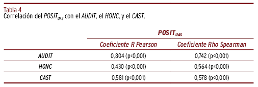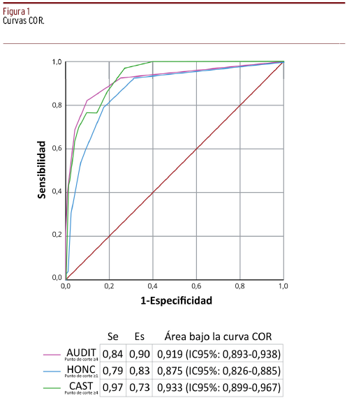 RESULTADOS // El POSITUAS resultó ser un instrumento unidimensional, con una elevada consistencia interna (KR-20=0,84) y una excelente capacidad de cribado. Presentó un equilibrio entre sensibilidad y especificidad, así como un área bajo la curva COR, aceptables, tanto en el consumo de alcohol (se=0,84; es=0,90; curva COR=0,92) como de tabaco (se=0,79; es=0,83; curva COR=0,87) y cannabis (se=0,97; es=0,73; curva COR=0,93).