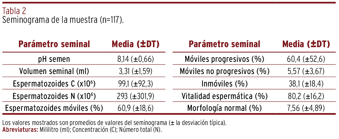 MÉTODOS // Se reclutaron 117 hombres de parejas infértiles desde diciembre de 2021 hasta octubre de 2023 que acudieron a la consulta de Ginecología-Esterilidad en el Hospital de Denia (España). Las variables antropométricas fueron recogidas mediante una exploración física y las clínicas con la realización de un seminograma. El análisis estadístico se llevó a cabo usando la prueba U de Mann-Whitney y modelos de regresión lineal.