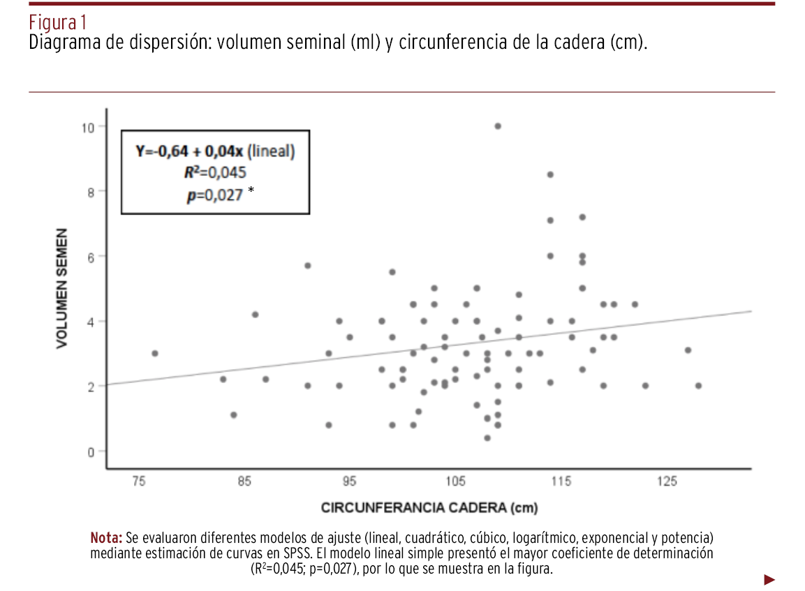 RESULTADOS // Nuestro trabajo mostró una relación lineal directa y significativa (p=0,027) entre la circunferencia de la cadera y el volumen seminal. No se encontró asociación entre el resto de parámetros antropométricos y la calidad seminal.