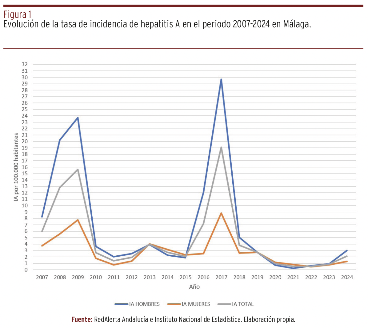 FUNDAMENTOS // La transmisión sexual de la hepatitis A (VHA) está documentada, principalmente por conductas de riesgo en hombres que tienen sexo con hombres (HSH). En los últimos años están apareciendo brotes de VHA en HSH. El objetivo de este trabajo fue analizar la evolución temporal de los casos de VHA en Málaga desde 2007 hasta 2024 para detectar cambios en el patrón epidemiológico de la enfermedad.