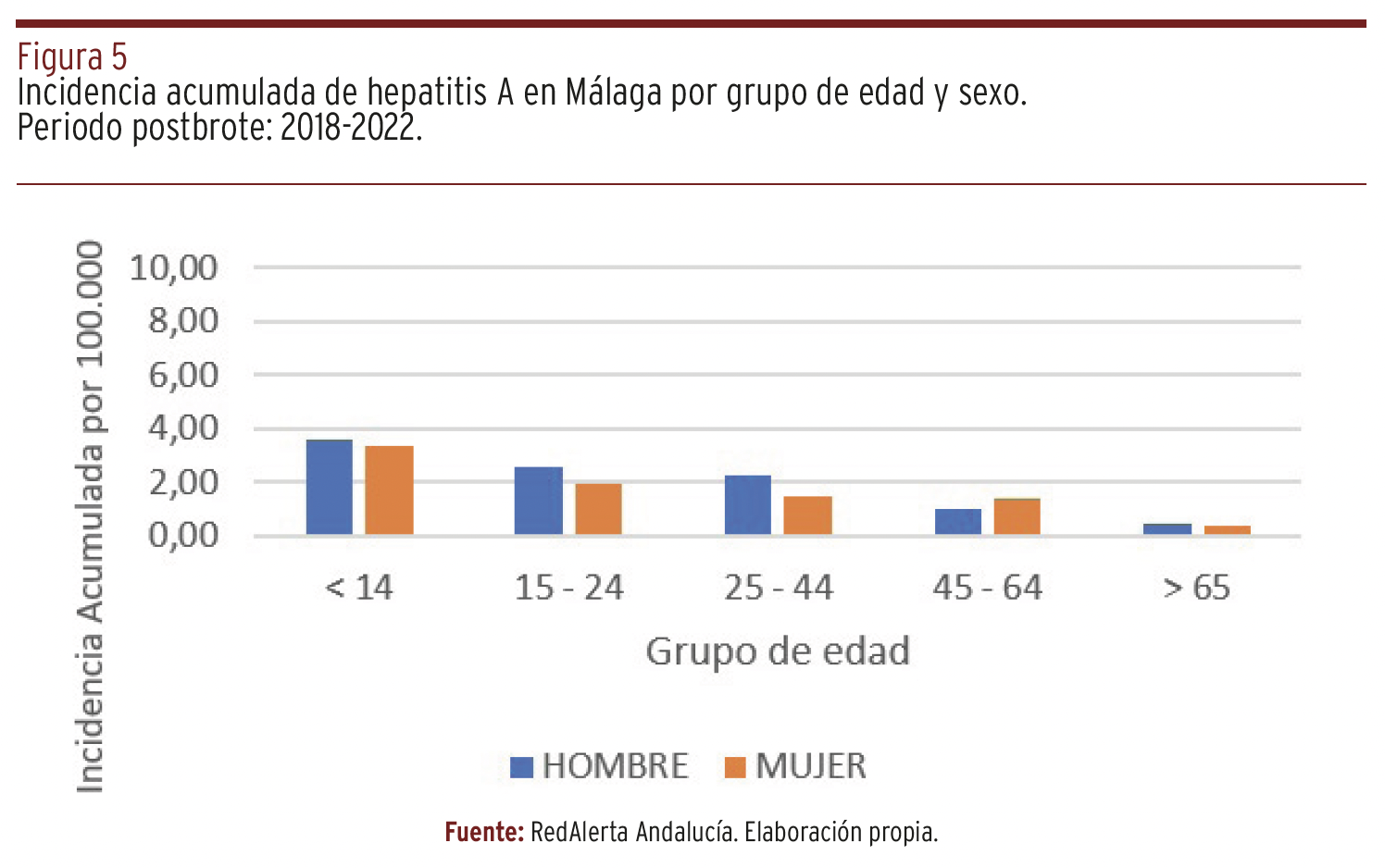 MÉTODOS // Se realizó un estudio descriptivo retrospectivo de los casos de VHA declarados en el Sistema de Vigilancia Epidemiológica de Andalucía (SVEA) entre enero de 2007 y el 24 de noviembre de 2024. Se calculó la incidencia anual (IA) por cada 100.000 habitantes. Se estudió la distribución por grupo de edad y sexo por año y en los periodos de brotes (2008-2009; 2016-2017) y periodos interbrotes (2010-2015; 2018-2022; 2023-2024). Para el análisis de los datos se utilizó Microsoft Excel y el método de Poisson para el cálculo de los intervalos de confianza al 95% de la razón hombre/mujer.