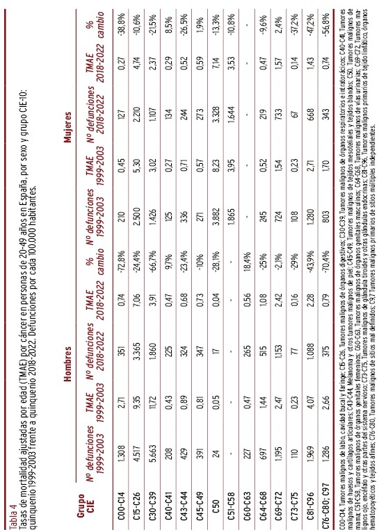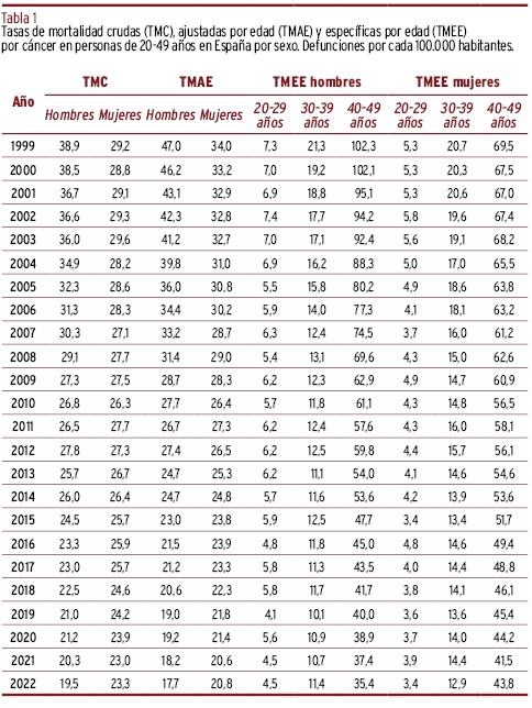 El objetivo de este trabajo fue analizar la evolución de la mortalidad por cáncer en población entre 20 y 49 años en España entre 1999-2022, según sexo, edad, región y grupo tumoral.