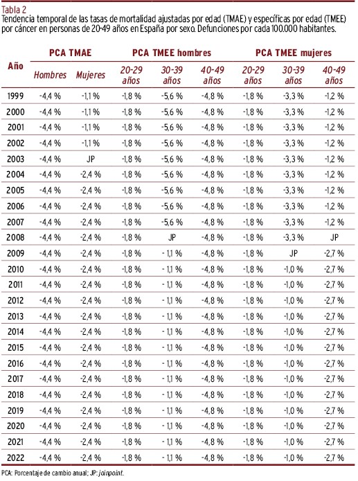 El objetivo de este trabajo fue analizar la evolución de la mortalidad por cáncer en población entre 20 y 49 años en España entre 1999-2022, según sexo, edad, región y grupo tumoral.