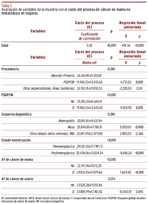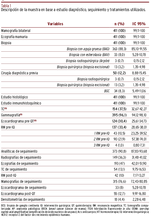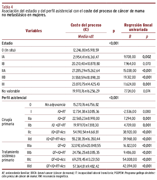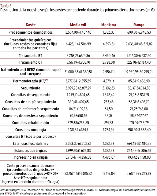 MÉTODOS // Se realizó un estudio descriptivo retrospectivo en 411 mujeres, tras muestreo aleatorio sistemático, diagnosticadas de cáncer de mama no metastásico e intervenidas quirúrgicamente en el Hospital Abente y Lago (A Coruña) durante 2010-2013. La información se obtuvo de las historias clínicas y bases de datos. Para evaluación de costes se tuvieron en cuenta tarifas de los servicios sanitarios en el Servicio Gallego de Salud. Se realizaron análisis univariantes y multivariantes.