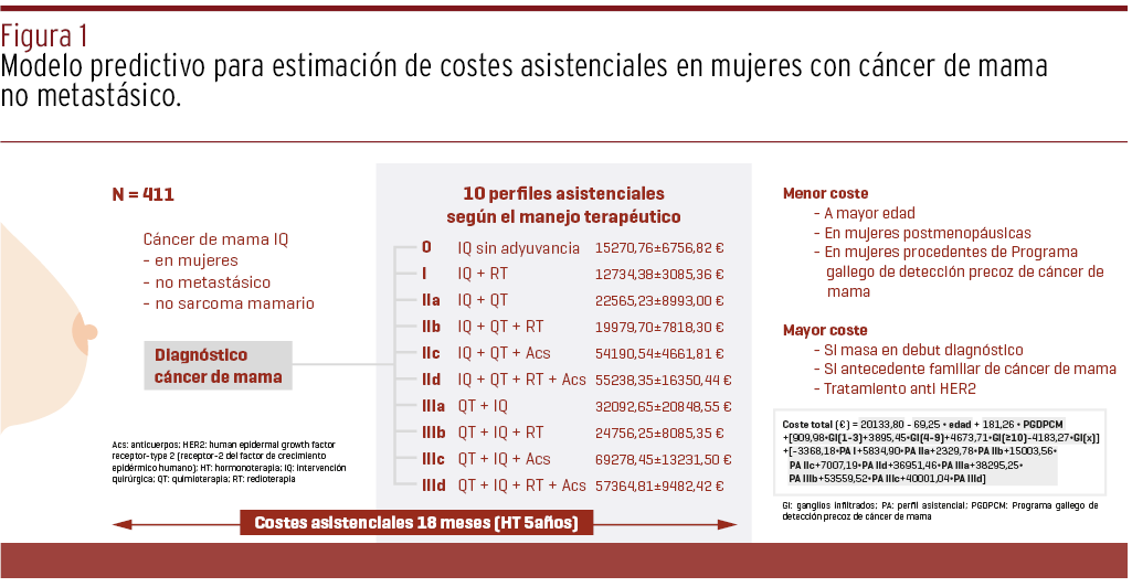 FUNDAMENTOS // La justificación de la investigación fue el abordaje económico del cáncer de mama para poder introducir mejoras. Los objetivos fueron conocer el coste final en cada subgrupo de mujeres con cáncer de mama no metastásico, conocer el coste medio por paciente, predecir el coste e identificar grupos con mayor impacto económico para los sistemas sanitarios.
