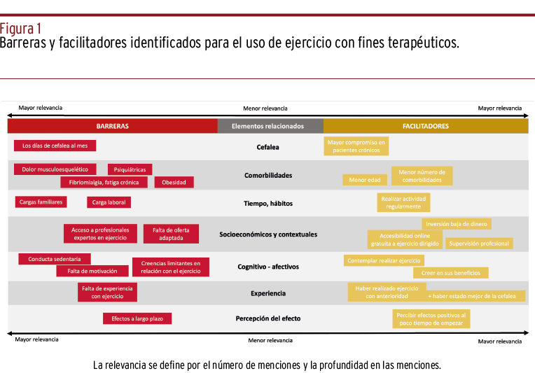 RESULTADOS // El 100% de los participantes recomendó ET, destacando el ejercicio aeróbico de intensidad moderada como modalidad preferente, especialmente para la migraña crónica. Actualmente, la implementación se limita a recomendaciones verbales y folletos informativos. Las barreras principales incluyen la frecuencia de la cefalea, las comorbilidades dolorosas y la falta de oferta adaptada. Como facilitadores, se identificaron la experiencia previa con ejercicio y la supervisión por parte de un profesional, destacando el papel del fisioterapeuta en este ámbito.