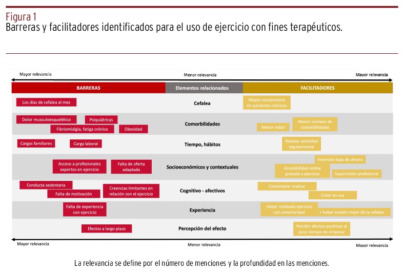 RESULTADOS // El 100% de los participantes recomendó ET, destacando el ejercicio aeróbico de intensidad moderada como modalidad preferente, especialmente para la migraña crónica. Actualmente, la implementación se limita a recomendaciones verbales y folletos informativos. Las barreras principales incluyen la frecuencia de la cefalea, las comorbilidades dolorosas y la falta de oferta adaptada. Como facilitadores, se identificaron la experiencia previa con ejercicio y la supervisión por parte de un profesional, destacando el papel del fisioterapeuta en este ámbito.