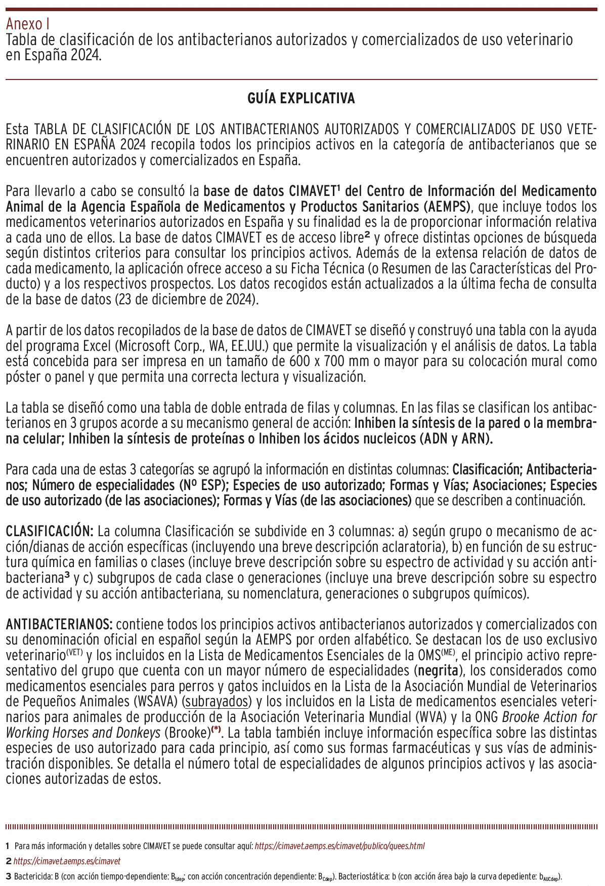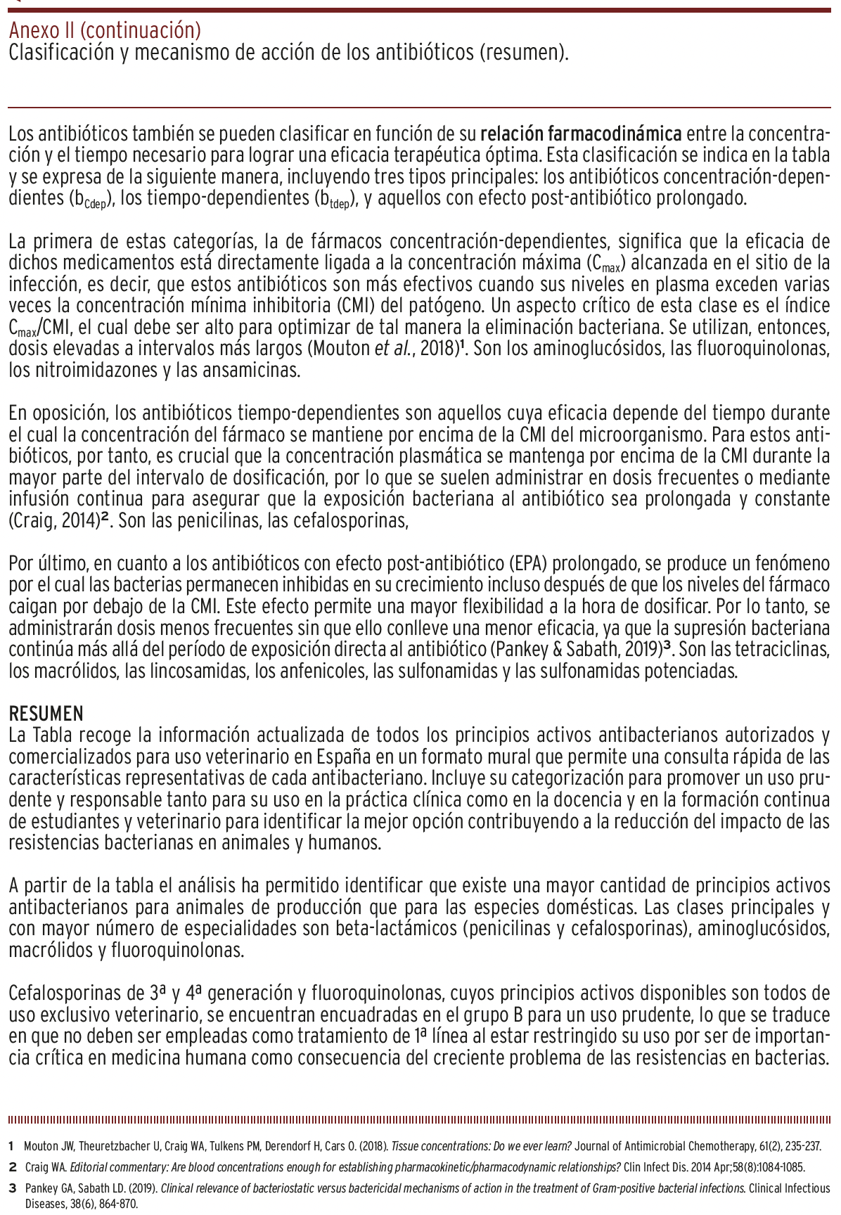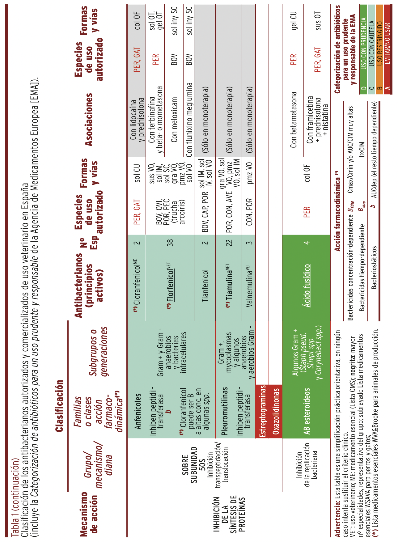 CONCLUSIONES // Esta tabla pretende contribuir a la mejora de una adecuada y prudente prescripción clínica y promover el aprendizaje y la enseñanza de los antibacterianos y a la lucha contra las resistencias bacterianas en un contexto One Health, interrelacionando salud humana, animal y medioambiental. La tabla puede ser adaptada a los antibacterianos disponibles en otros países.
