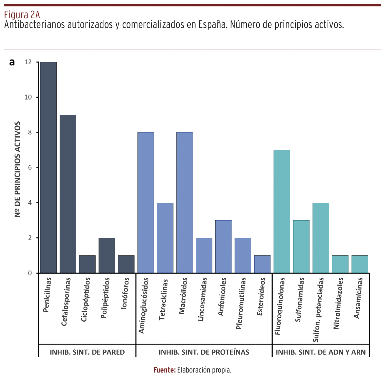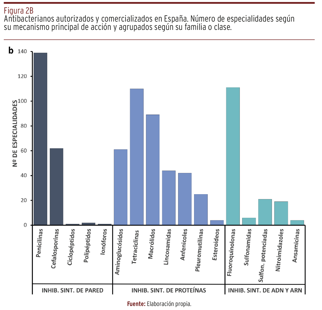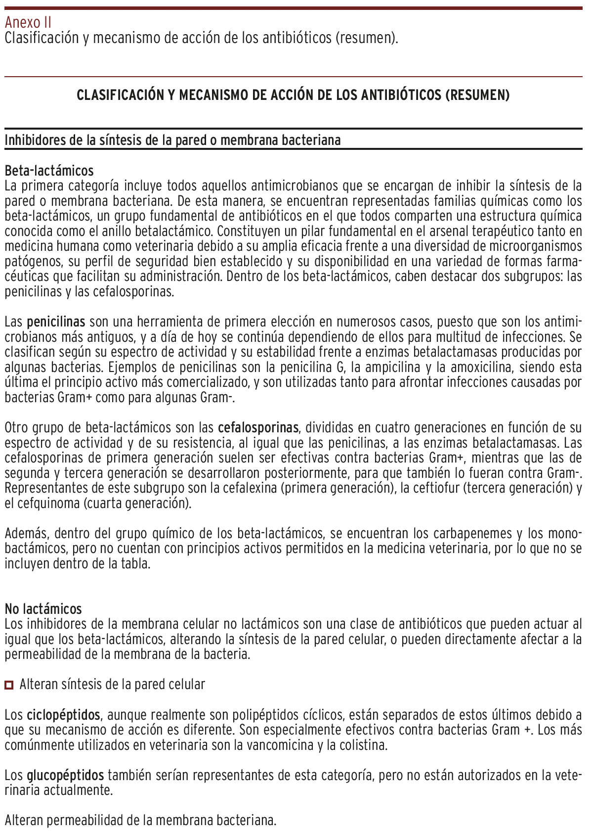 RESULTADOS // La tabla recoge un total de 68 principios activos en 761 especialidades de uso en 12 especies animales. En perros y gatos se dispone de 30 y en animales de producción de 54. Las clases principales y con mayor número de especialidades son beta-lactámicos (penicilinas y cefalosporinas), aminoglucósidos, macrólidos y fluoroquinolonas. Cefalosporinas de 3ª y 4ª generación y fluoroquinolonas no deben ser empleadas como tratamiento de 1ª línea.