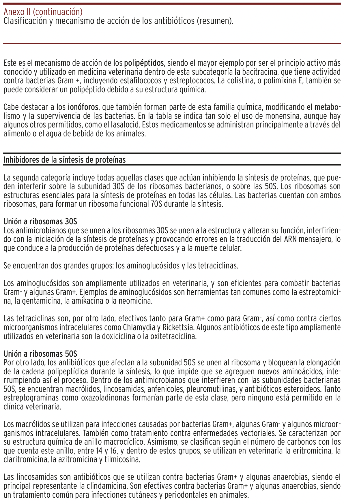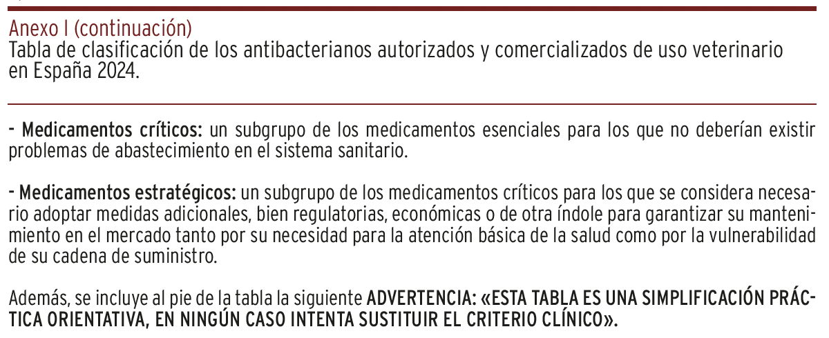 FUNDAMENTOS // Esta revisión viene justificada por promover un mejor conocimiento de los antibacterianos usados en veterinaria entre todos los profesionales de la salud. Con este objetivo se ha desarrollado una herramienta de referencia rápida para un uso prudente y responsable de los antibacterianos autorizados en animales, acorde a su categorización para reservar aquellos críticos en medicina humana, frente el creciente problema del aumento de bacterias resistentes o multirresistentes.