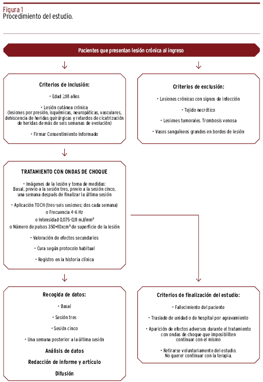 MÉTODOS // Se preparará un diseño cuasiexperimental sin grupo control. El ámbito se ceñirá a pacientes mayores de dieciocho años con lesiones cutáneas ingresados en un hospital de media estancia. El tamaño muestral necesario será de treinta lesiones cutáneas crónicas. La intervención oscilará entre tres a seis sesiones de ondas de choque. La variable de resultado principal será la superficie de la lesión. Otras variables consideradas serán las demográficas, los factores influyentes en la cicatrización y los efectos secundarios. El análisis será descriptivo mediante frecuencias absolutas y relativas, así como medianas y percentiles; también será analítico con tests no paramétricos en contraste de hipótesis. La significación se fijará en el 5%. Se empleará el software estadístico STATA v18. El protocolo debe ser aprobado por el comité de ética correspondiente, y deben seguirse las normas SPIRIT, amén de estar registrado en www.clinicaltrials.gov.