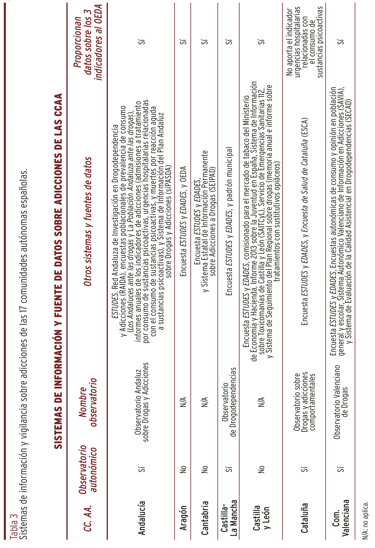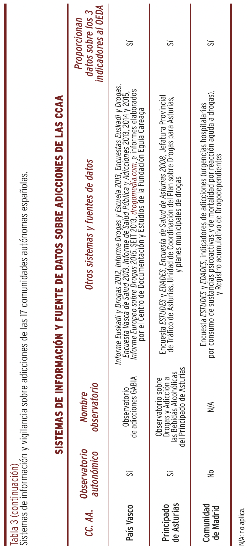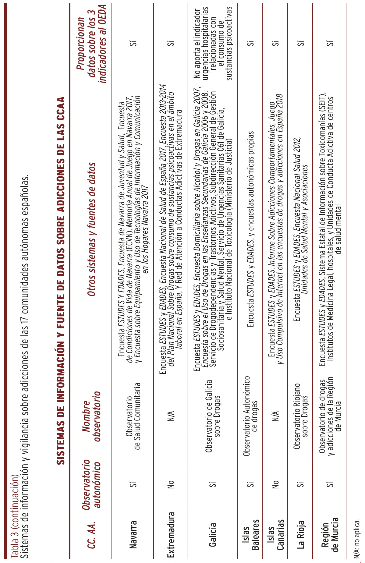 RESULTADOS // Se seleccionaron diecisiete planes autonómicos de salud y diecinueve sobre adicciones. Las adicciones con sustancia contempladas en dichos planes diferían según la comunidad autónoma (C. A.); si bien, la mayoría incluían datos sobre tabaco, alcohol, hipnosedantes y cannabis. Cantabria, la Comunidad de Madrid, la Comunidad Valenciana, el Principado de Asturias y Melilla abordaban exclusivamente las adicciones con sustancia en su plan sobre adicciones. El juego con dinero y el uso compulsivo de internet fueron las adicciones sin sustancia más contempladas. Las principales fuentes de información y vigilancia que aportaron datos sobre la prevalencia fueron las encuestas EDADES y ESTUDES, encuestas autonómicas de salud o drogas, así como sistemas estatales o autonómicos de información sobre toxicomanías. Once CC. AA. disponían de Observatorios Autonómicos sobre drogas.