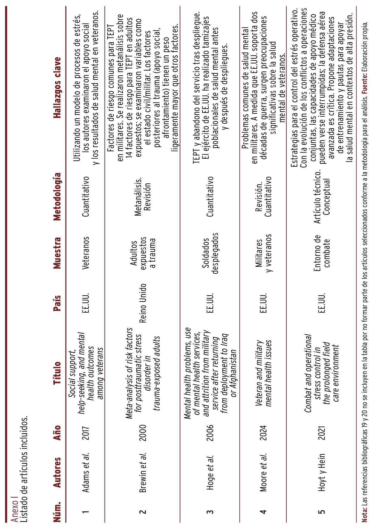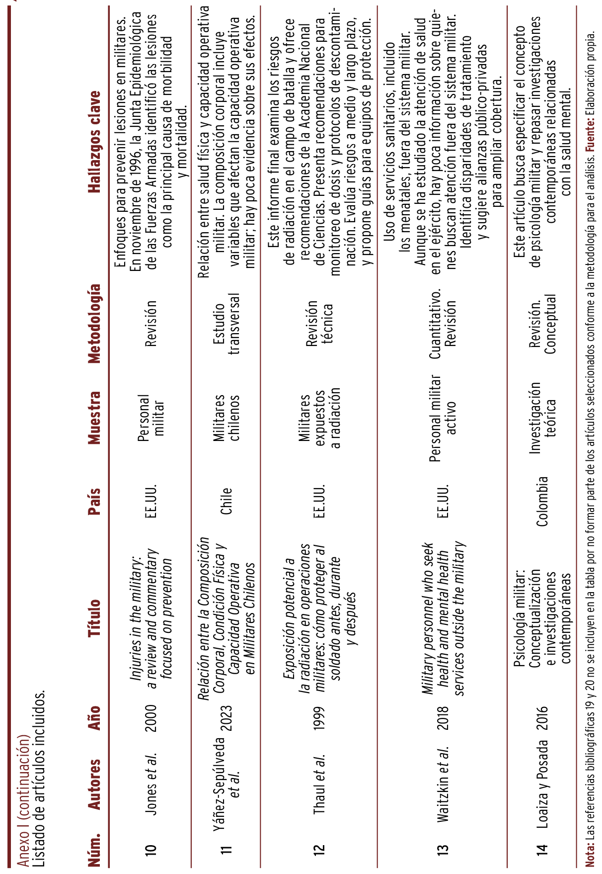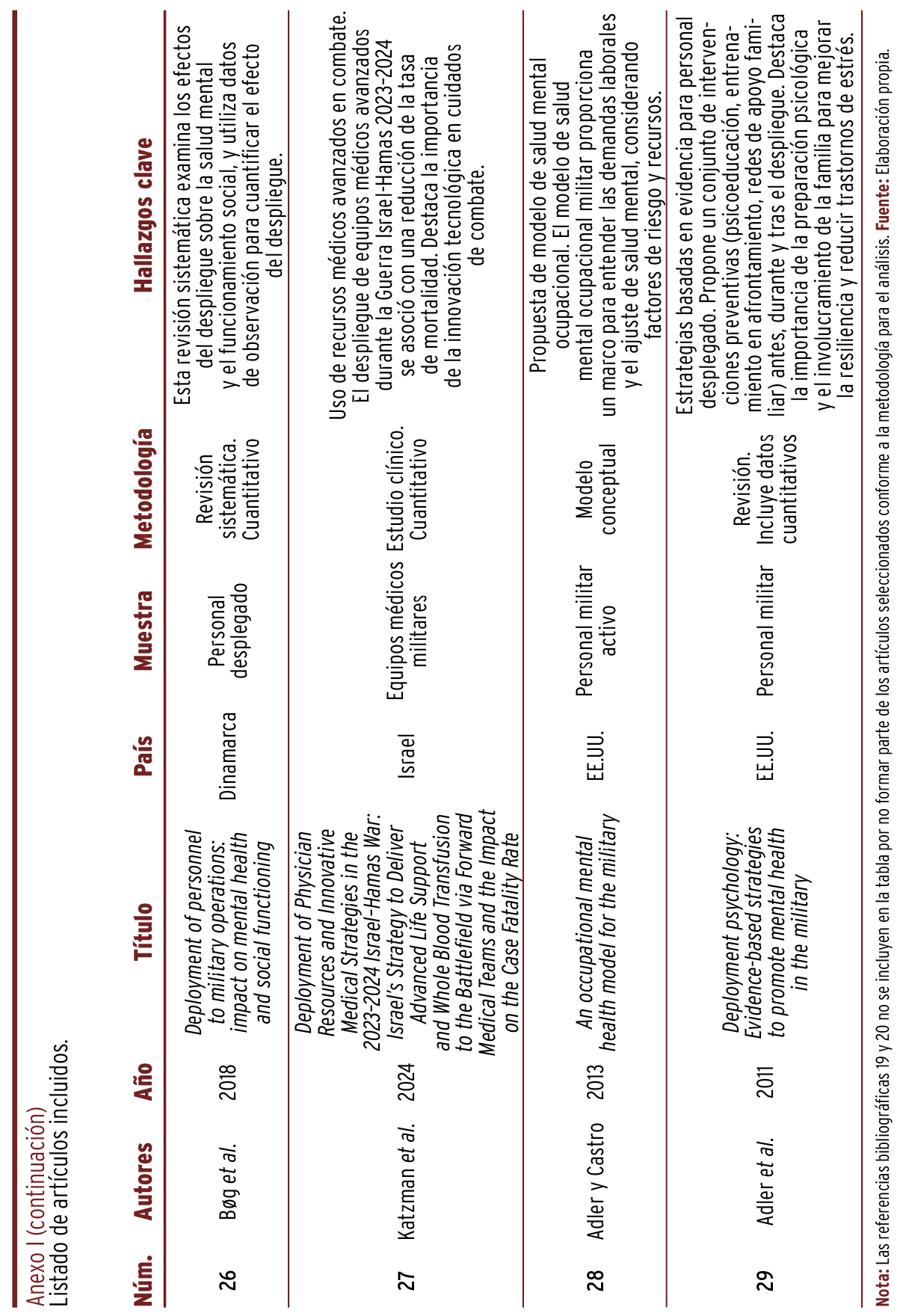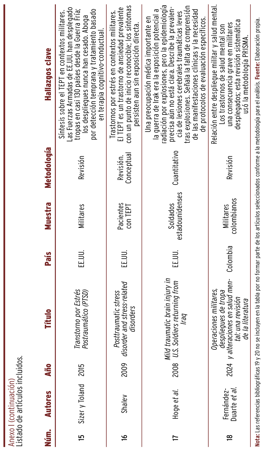 18. Fernández-Duarte CA, Flores-Pedroso MD, Gonzales-Calle S, García-Carrillo JA, Urazan-Chinchilla JC. Operaciones militares, despliegues de tropa y alteraciones en salud mental: una revisión de la literatura. Brújula Semilleros Investig. 2024;12(23):48-73. https://doi.org/10.21830/23460628.159