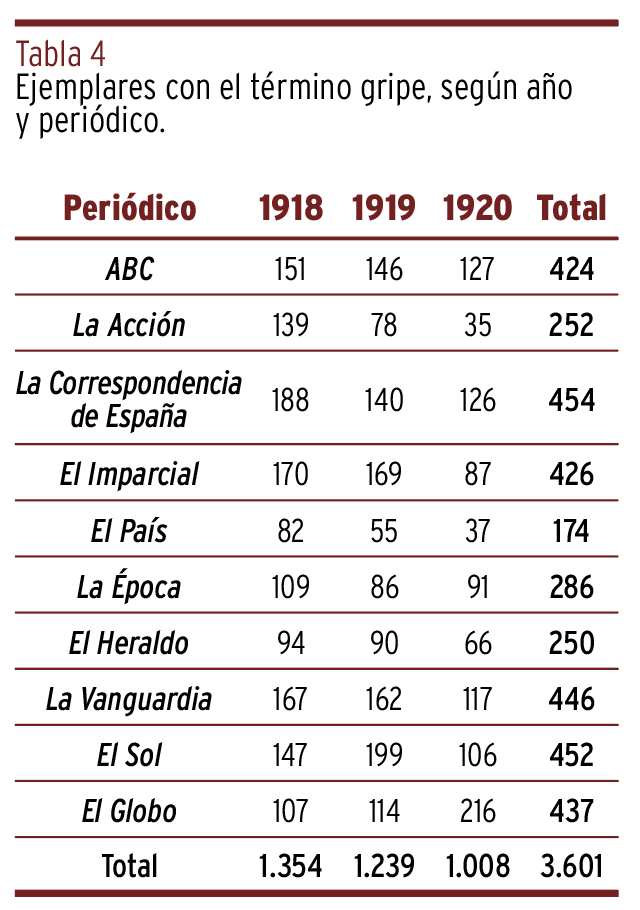 RESULTADOS // Los periódicos analizados informaron del número de personas que enfermaron y murieron a consecuencia de la epidemia de gripe. Se publicaron un total de 3.601 ejemplares, destacando un incremento durante el segundo brote de la epidemia, siendo el periódico ABC el que más informaciones publicó acerca de la mortalidad.