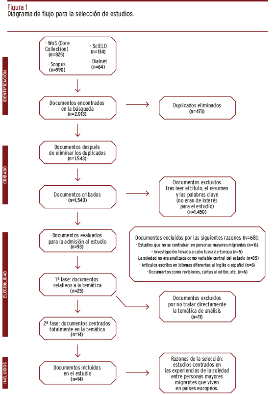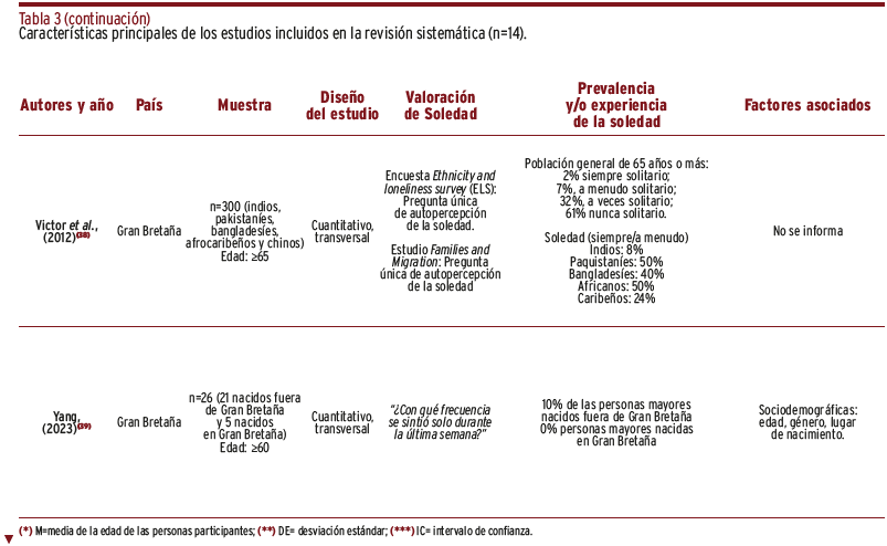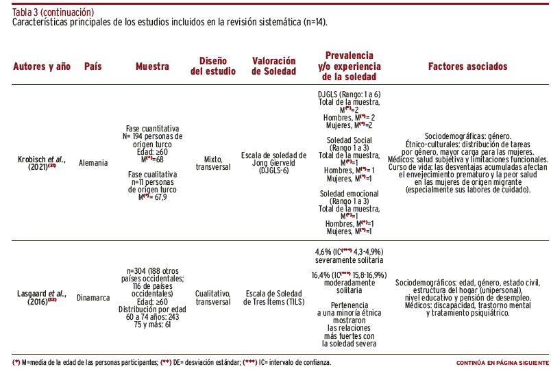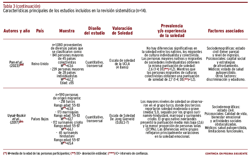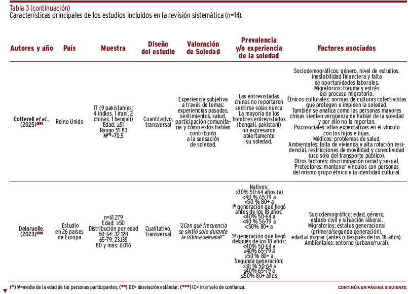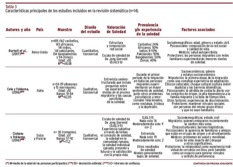 RESULTADOS // Se encontraron 2.013 referencias y, tras la valoración del texto completo, se incluyeron un total de 14 artículos. Los resultados sobre prevalencia de la soledad fueron heterogéneos, aunque seis artículos mostraron una prevalencia mayor al 40%. En términos generales, los estudios indicaron la influencia de factores sociodemográficos, migratorios, étnicos-culturales, psicosociales, de curso de vida, médicos y otros como la discriminación.