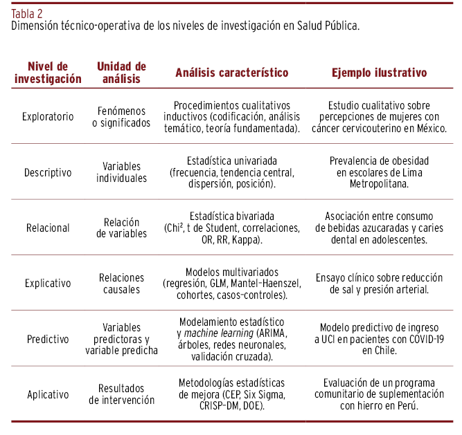 RESULTADOS // Emergieron seis niveles definidos por el tipo de análisis: exploratorio (sin estadística); descriptivo (univariada); relacional (bivariada); explicativo (multivariada); predictivo (modelamiento); y aplicativo (metodologías de mejora). Cada nivel se delimitó operativamente (propósito, unidad de análisis, técnicas y ejemplo) para su uso reproducible en evaluación y planificación.