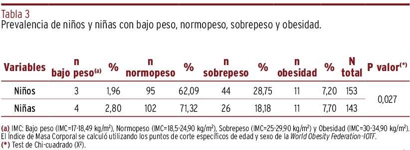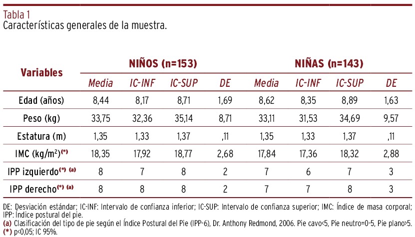 MÉTODOS // Estudio transversal (2021) en una muestra de escolares (n=296, 153 niños y 143 niñas, edad media 8,5±2,7) del Colegio San Agustín de Zaragoza. La postura del pie se evaluó según el índice postural del pie, y el estado ponderal se obtuvo mediante el índice de masa corporal según criterios de la International Obesity Task Force. Se analizó la correlación entre el estado ponderal y la postura del pie con el coeficiente de Spearman. Mediante la prueba Chi-cuadrado se determinaron las diferencias entre las variables según sexo.