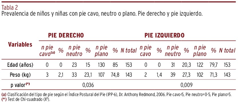 RESULTADOS // El estado ponderal no mostró correlación respecto a la postura del pie (ρ=0). Los niños presentaron una prevalencia mayor de pies planos que las niñas (IPP=7; IPP=6; PD p<.036; PI p<.009). Los niños tuvieron mayor prevalencia de sobrepeso respecto a las niñas (28,75; 18,18, p<.027).