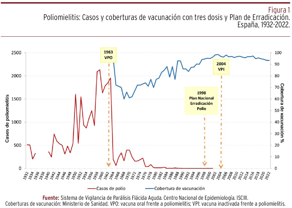Al cumplirse sesenta años desde el inicio de la campaña de vacunación frente a la poliomielitis en España, se destaca el importante hito en el control de la enfermedad que ha supuesto el cambio desde una incidencia de más de 2.000 casos anuales en la década de los 60 a una ausencia mantenida de poliovirus (PV) salvaje desde 1988. A pesar del impacto negativo observado en las coberturas de vacunación de poliomielitis al inicio de la pandemia de COVID-19, estas se fueron recuperando, alcanzando un 98,2% en la primovacunación en 2022. En la última década, se han identificado dos elementos esenciales para mantener el objetivo de eliminación de la poliomielitis y que, además, refuerzan la importancia de mantener altas coberturas de vacunación: los sistemas de vigilancia epidemiológica robustos y la respuesta rápida a las alertas para proteger a la población vulnerable y evitar la circulación del virus. Es crucial interrumpir la transmisión a nivel internacional para lograr la erradicación, manteniendo una vigilancia continua de alta calidad y una coordinación efectiva entre los diferentes niveles frente a cualquier detección de PV, ya sea salvaje o derivado de la vacuna.