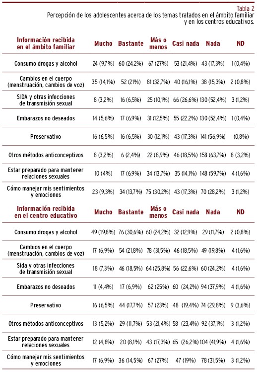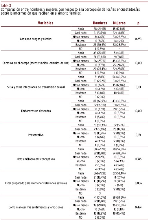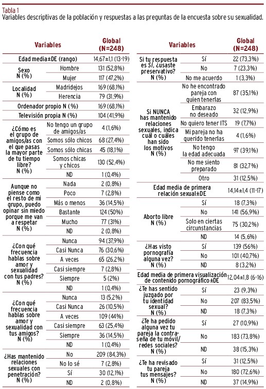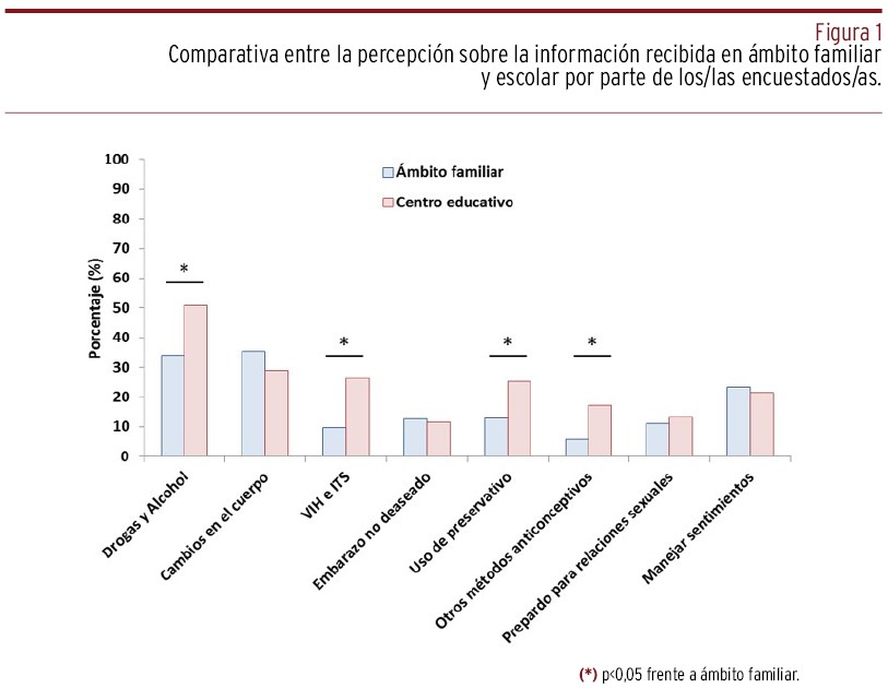 RESULTADOS // Se incluyeron 248 encuestados/as (68,1% de Madridejos y 31,9% de Herencia) con una edad media de 14,67±1,1 años. El 47,2% fueron mujeres. Solo un 4,8% de los/as encuestados/as afirmaron hablar sobre sexualidad con sus progenitores. Un 56% afirmaron haber consumido contenido pornográfico, siendo la edad media de la primera visualización de 12,8±1 años. Se encontraron diferencias estadísticamente significativas entre la información recibida en los centros educativos y el ámbito familiar, tratándose más frecuentemente el consumo de alcohol y drogas, las infecciones de transmisión sexual (ITS) y los métodos anticonceptivos en los centros. Un cuarto de los/as encuestados/as que afirmaron haber tenido relaciones sexuales no habían utilizado preservativo. Aproximadamente, la mitad de los/as participantes no percibieron un riesgo alto de contraer ITS (VIH, herpes y clamidia) en el caso de mantener relaciones sexuales sin preservativo.
