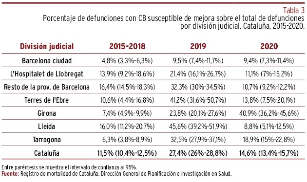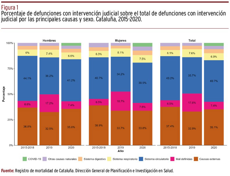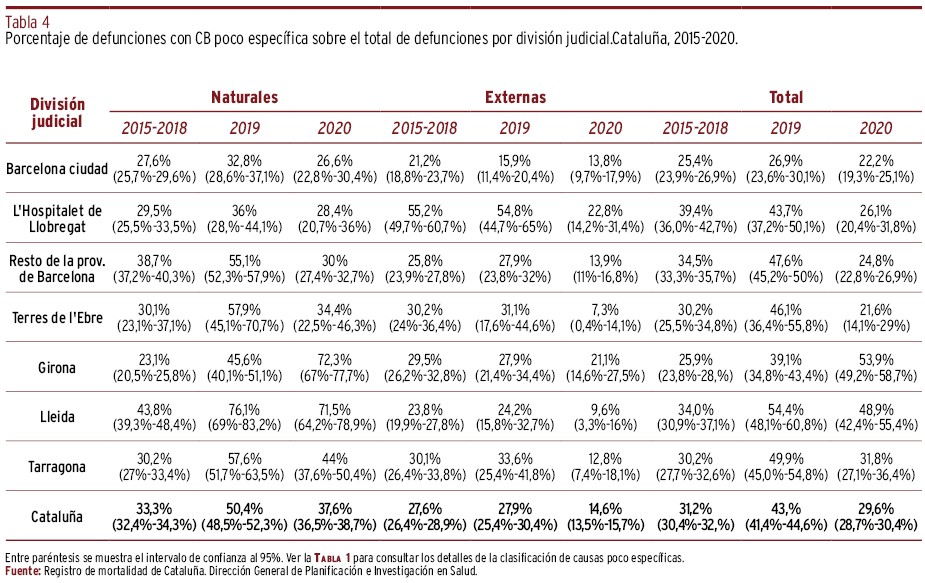 MÉTODOS // Se realizó un estudio descriptivo utilizando datos de las defunciones con intervención judicial ocurridas en Cataluña. Se comparó la información del período 2015-2018 y de 2019 con la de 2020. Se calcularon los porcentajes, con intervalo de confianza, de las causas de defunción poco específicas, según diferentes clasificaciones, sobre el total de causas por período y división judicial.