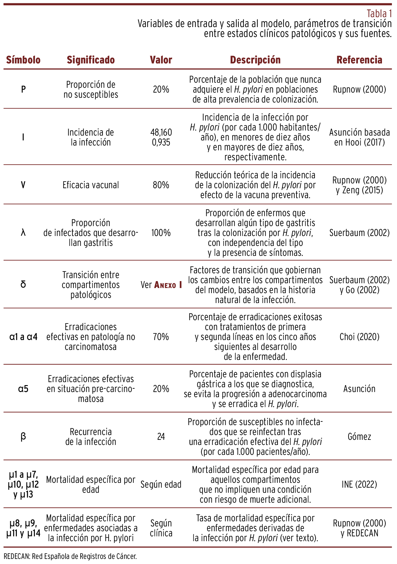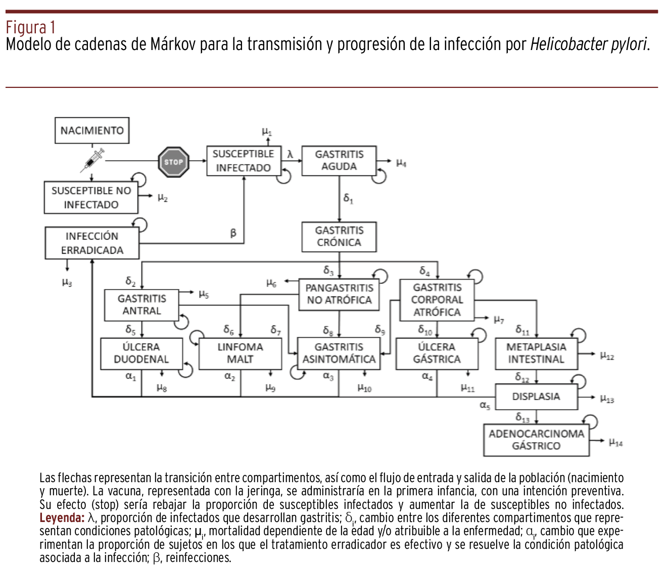 MÉTODOS // Se simuló la evolución de una cohorte de nacidos a través de un modelo compartimental representativo de varios estados clínicos en relación a la infección por H. pylori. Se ejecutó dicho modelo bajo las premisas de vacunación en el periodo de lactante y de no intervención. El horizonte temporal fue equivalente a la esperanza de vida y se tuvo en cuenta la perspectiva del sistema de salud.