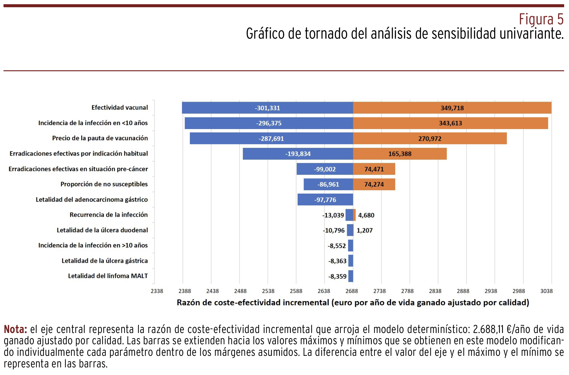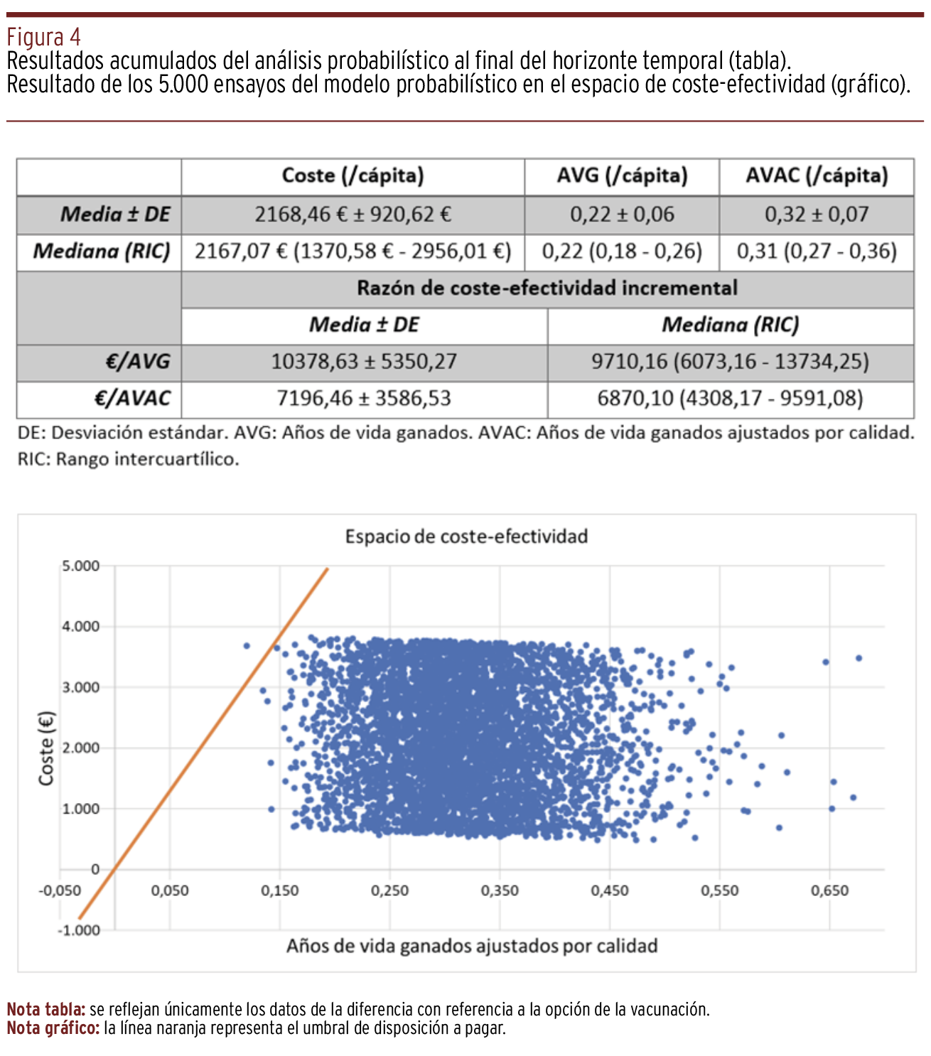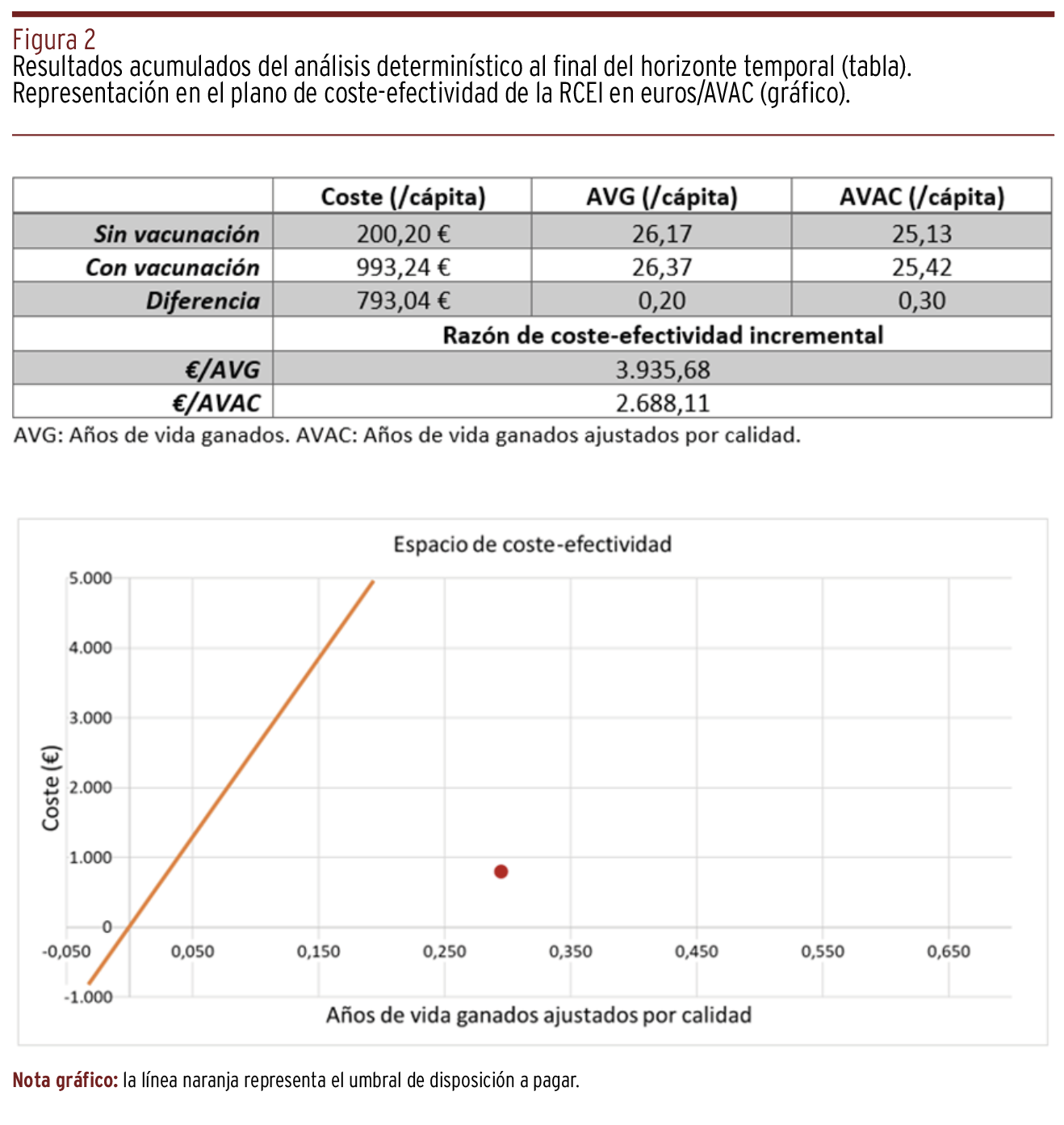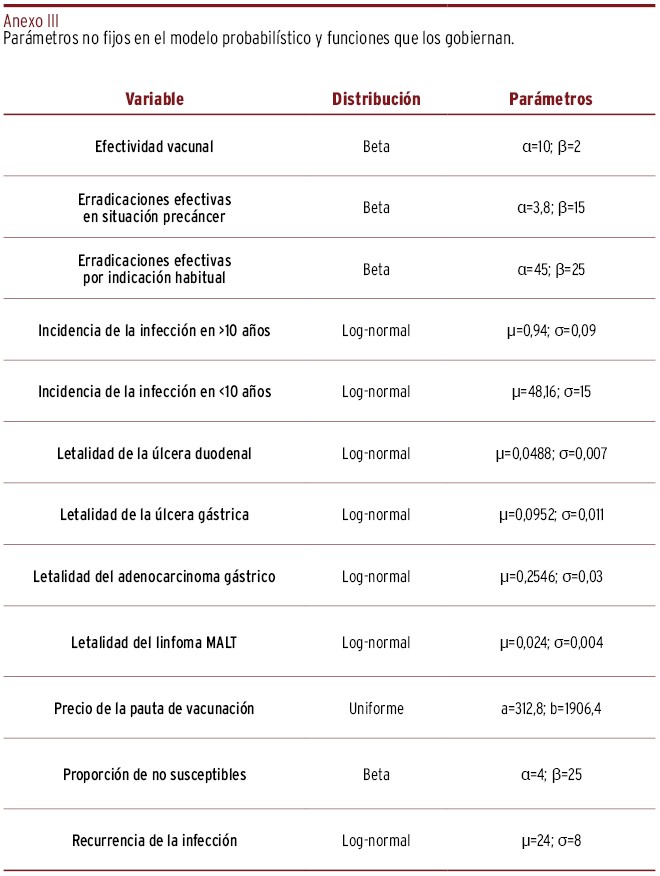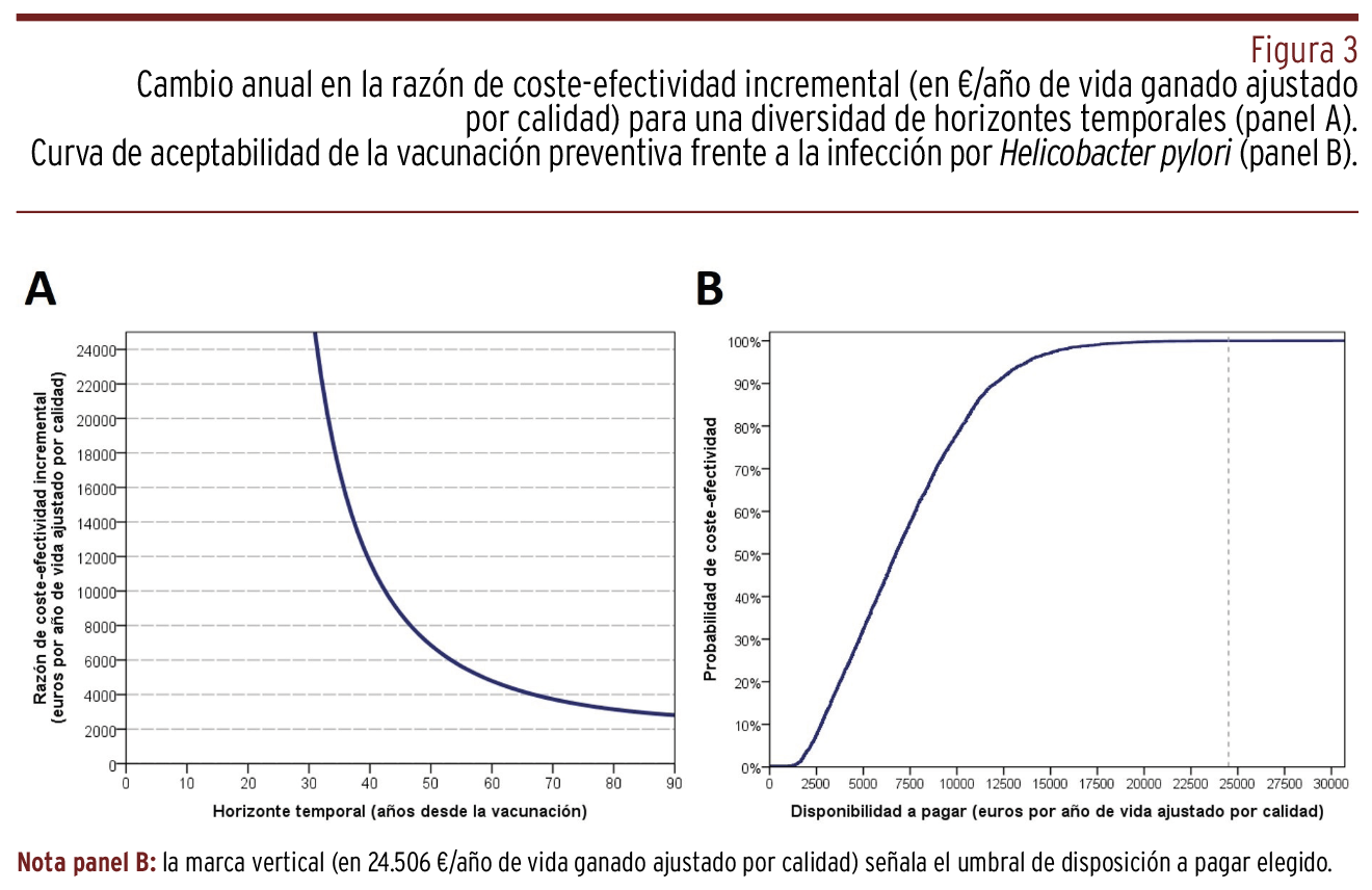 RESULTADOS // La vacunación frente a H. pylori costaría de media 2.168 €/persona más que la no intervención. Con ello se obtendrían 0,32 años de vida ganados ajustados por calidad (AVAC), lo que implicaría una razón de coste-efectividad incremental (RCEI) media de 7.196 €/AVAC. Para una disposición a pagar de 24.506 €/AVAC, el 99,96% de las simulaciones resultaron coste-efectivas al alcanzar el horizonte temporal y se cruzó dicho umbral a partir de los treinta años de la vacunación. Las variables que más peso tuvieron para explicar la variabilidad de la RCEI fueron, en este orden, la efectividad vacunal, la incidencia de la infección en la primera infancia y el precio de la vacuna. La vacunación dejaría de ser coste-efectiva con un precio mayor de 3.634€/vial o con una cobertura poblacional efectiva menor del 11%.