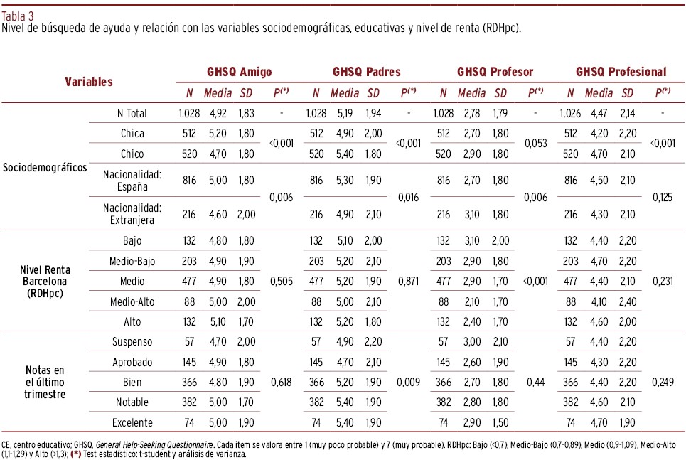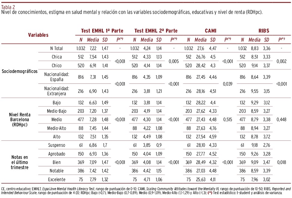 MÉTODOS // Se realizó un estudio transversal en Barcelona durante el curso 2017-2018. Participaron 1.032 jóvenes entre trece y diecisiete años. Se recogieron las siguientes variables: sexo; edad; nacionalidad; nivel socioeconómico (RDHpc); y nota media escolar. La ASM se midió mediante los test de conocimientos EMHL (reconocimiento de problemas mentales y conocimientos en salud mental; rango 0-10 cada parte), estigma (CAMI: rango 10-50, y RIBS: rango 4-20) y búsqueda de ayuda (GHSQ: rango de 1 a 7). Se realizó análisis de regresión lineal múltiple ajustando el efecto de variables sociodemográficas sobre la puntuación de cada escala.
