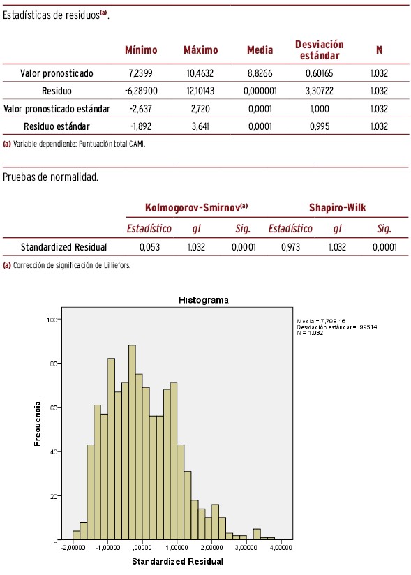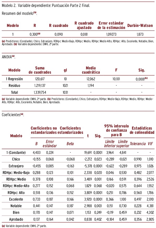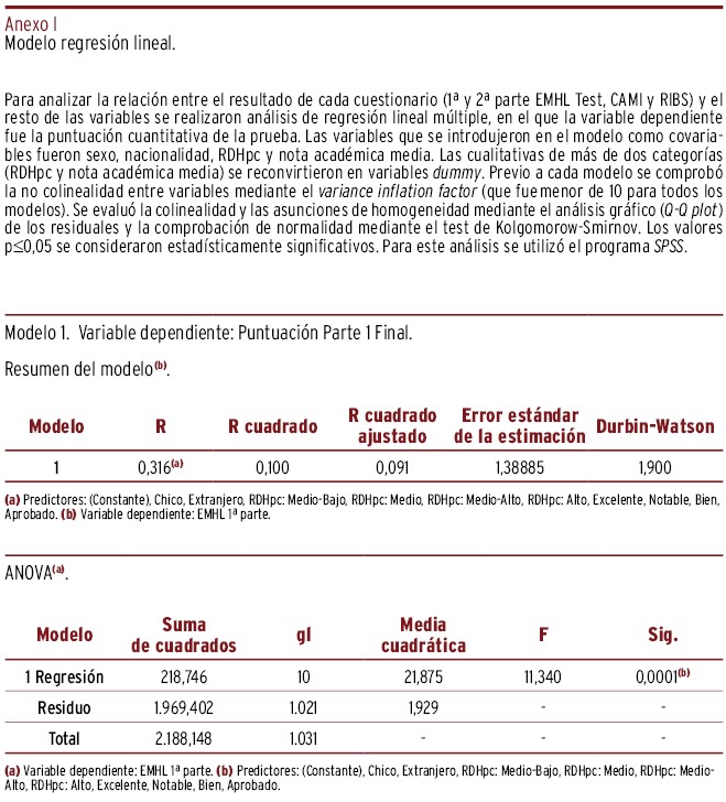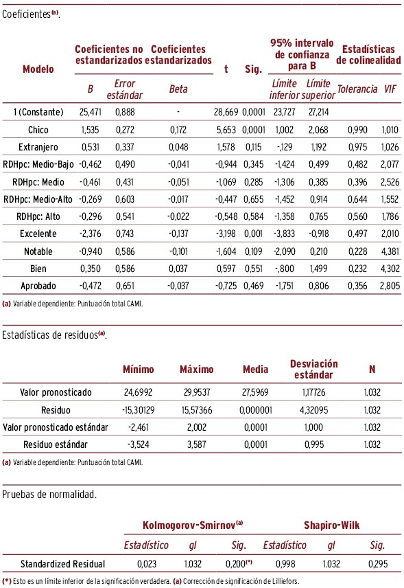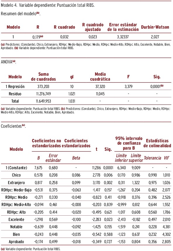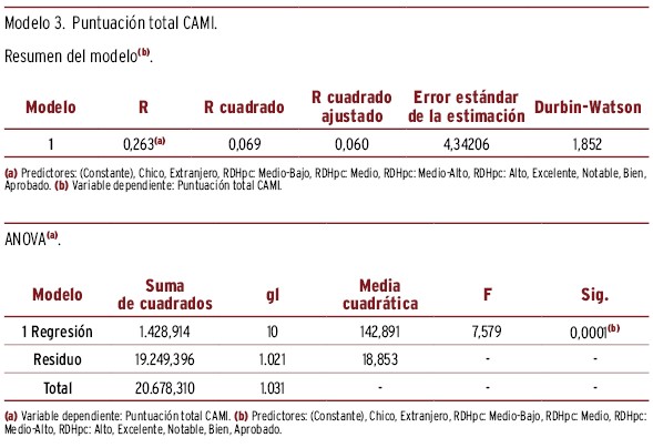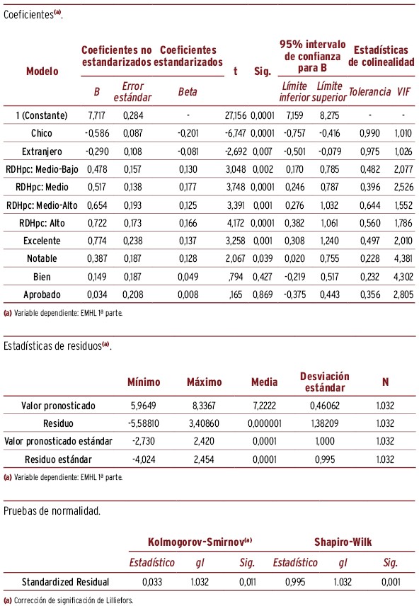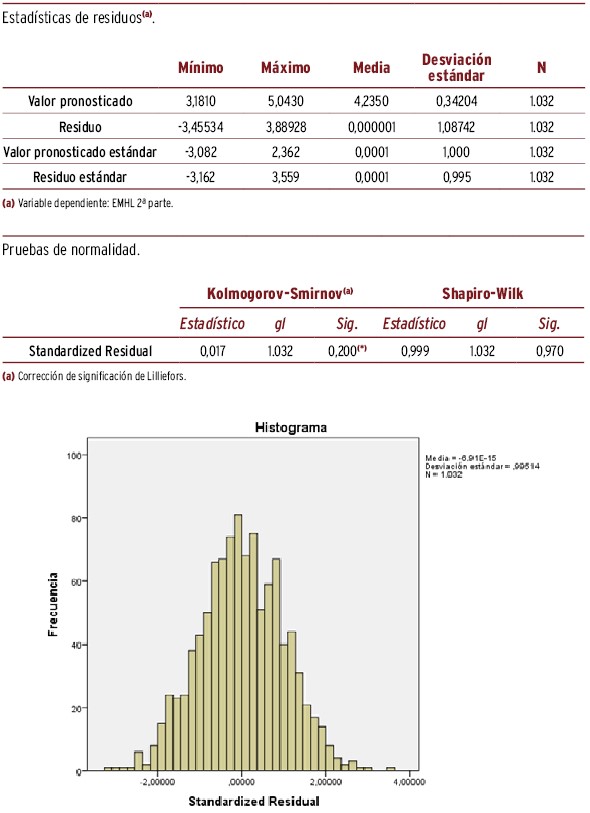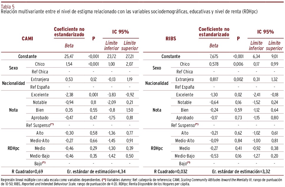 RESULTADOS // La puntuación media (desviación típica) del EMHL test fue de 7,28 (1,27) y 4,24 (1,14), respectivamente, obteniendo mayor puntuación las chicas, RDHpc altas, nota excelente y con nacionalidad española. La mayor diferencia de puntuación en EMHL, ajustando por el resto de variables, correspondió a los adolescentes con nota media excelente y con índice RDHpc elevado (respecto a la categoría basal, beta=0,72 y 0,52, respectivamente). La puntuación media del estigma fue 27,6 (4,47) para CAMI y 8,83 (3,36) para RIBS. Las variables relacionadas con una mayor diferencia de puntuación respecto a la categoría basal y ajustado por el resto de variables fueron: sexo (chico=1,54) y nota académica (excelente=-2,38) para CAMI, y nacionalidad (extranjera=0,82) y nota académica (excelente=-1,30) para RIBS. La puntuación media de RIBS fue 8,83 (3,36), siendo la mayor diferencia de puntuación respecto a la categoría basal la nacionalidad extranjera (beta=0,82) y tener una nota de excelente (1,30). La búsqueda de ayuda fue mayor en padres/madres y amigos, con diferencias según sexo y nacionalidad.