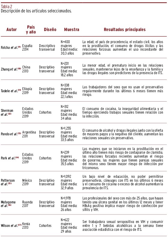 Belza MJ, Clavo P, Ballesteros J, Menéndez B, Castilla J, Sanz S et al. Condiciones sociolaborales, conductas de riesgo y prevalencia de infecciones de transmisión sexual en mujeres inmigrantes que ejercen la prostitución en Madrid. Gac Sanit. 2004;18(3):177-183.