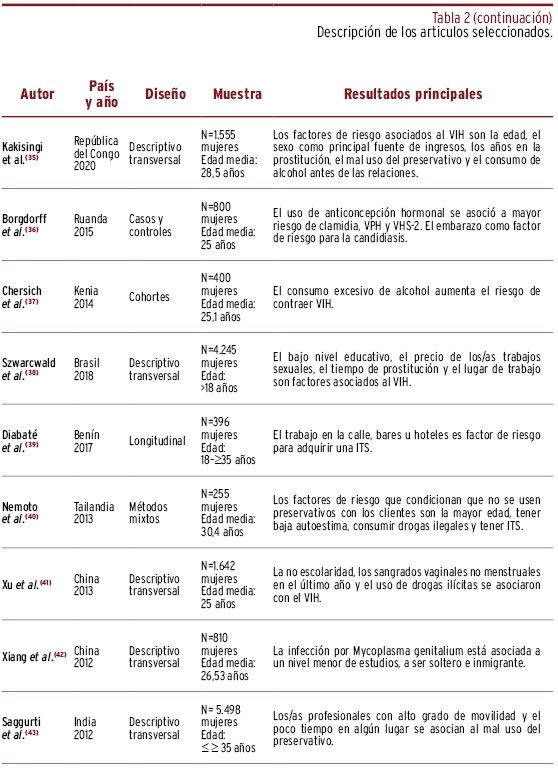 MÉTODOS // Se realizó una revisión sistemática mediante búsqueda en Scopus, Pubmed, CINAHL, Medline, LILACS e IBECS, de estudios observacionales, longitudinales y mixtos realizados en trabajadores/as del sexo que fueron publicados entre enero de 2011 y marzo de 2021, obteniendo una muestra final de cuarenta y tres artículos. La herramienta de evaluación de métodos mixtos (mixed methods assessment tool) fue utilizada para evaluar la calidad metodológica de los trabajos.