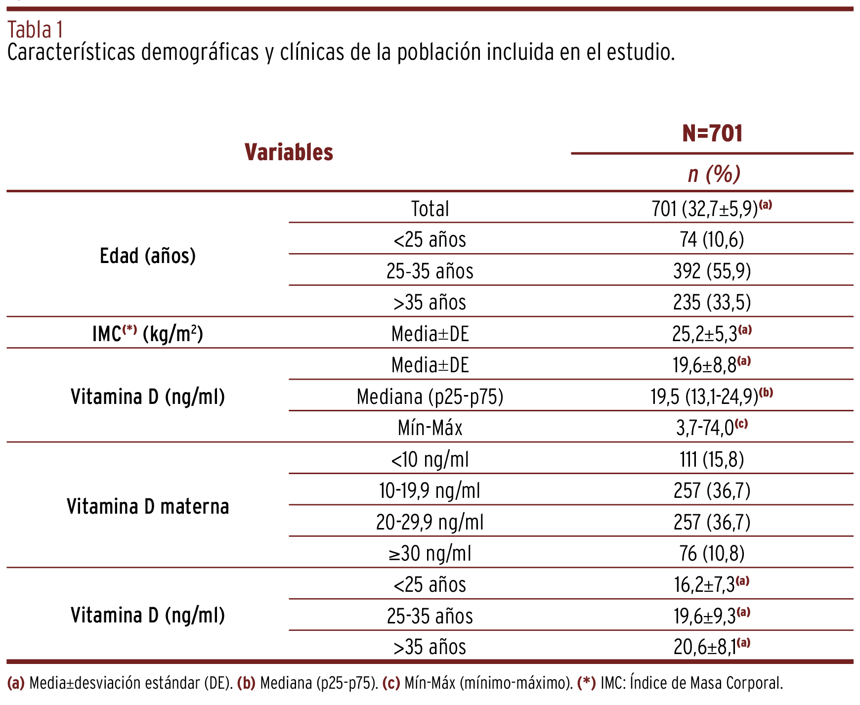 MÉTODOS // Se realizó un estudio descriptivo prospectivo en el que se incluyeron 701 mujeres gestantes controladas en el área sanitaria de Sagunto. Se determinaron los niveles de 25-hidroxivitamina D en sangre durante el primer trimestre del embarazo y se trataron aquellas mujeres con niveles subóptimos de vitamina D. Se analizaron las características demográficas de las mujeres para identificar factores asociados con el déficit de vitamina D. Se realizó un análisis de estadística descriptiva para todas las variables.