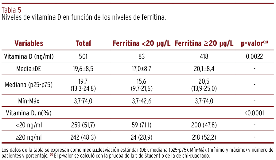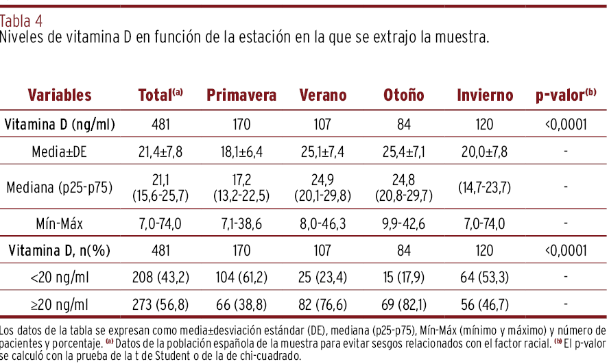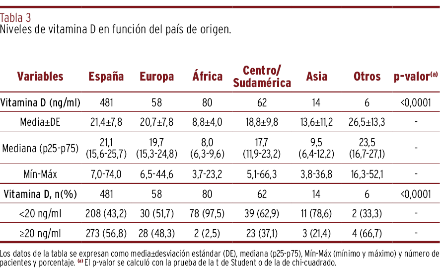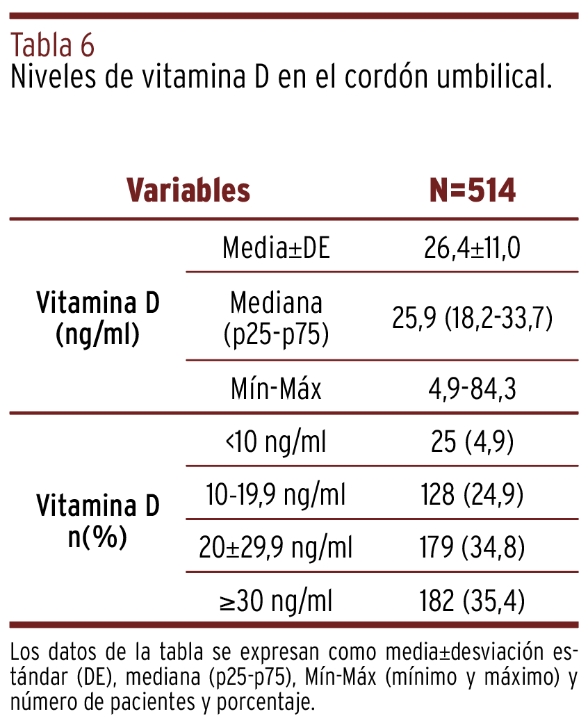 RESULTADOS // La media de los niveles de vitamina D en la población estudiada fue de 19,6 ng/ml. El 52,5% de las mujeres gestantes en la población global tenía niveles menores a 20 ng/ml que requirieron suplementación con vitamina D oral, mientras que el 97% de las mujeres de origen africano presentó niveles subóptimos. Las gestantes con obesidad o sobrepeso y las menores de veinticinco años (62% y 71%, respectivamente) mostraron niveles inadecuados de vitamina D en mayor proporción que las mujeres sin sobrepeso o con 25 años o más. Las muestras extraídas en invierno y primavera presentaron niveles más bajos de vitamina D en comparación con las de otras estaciones.