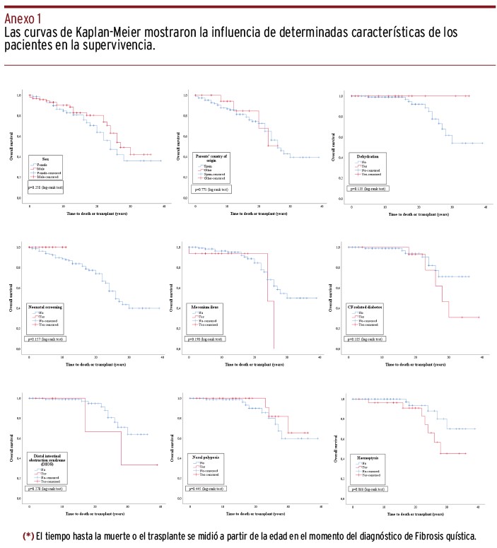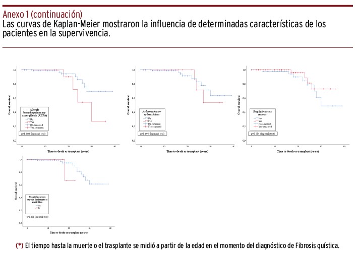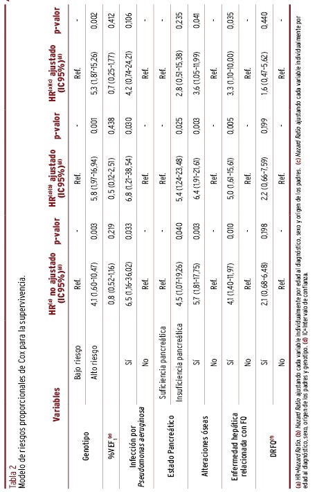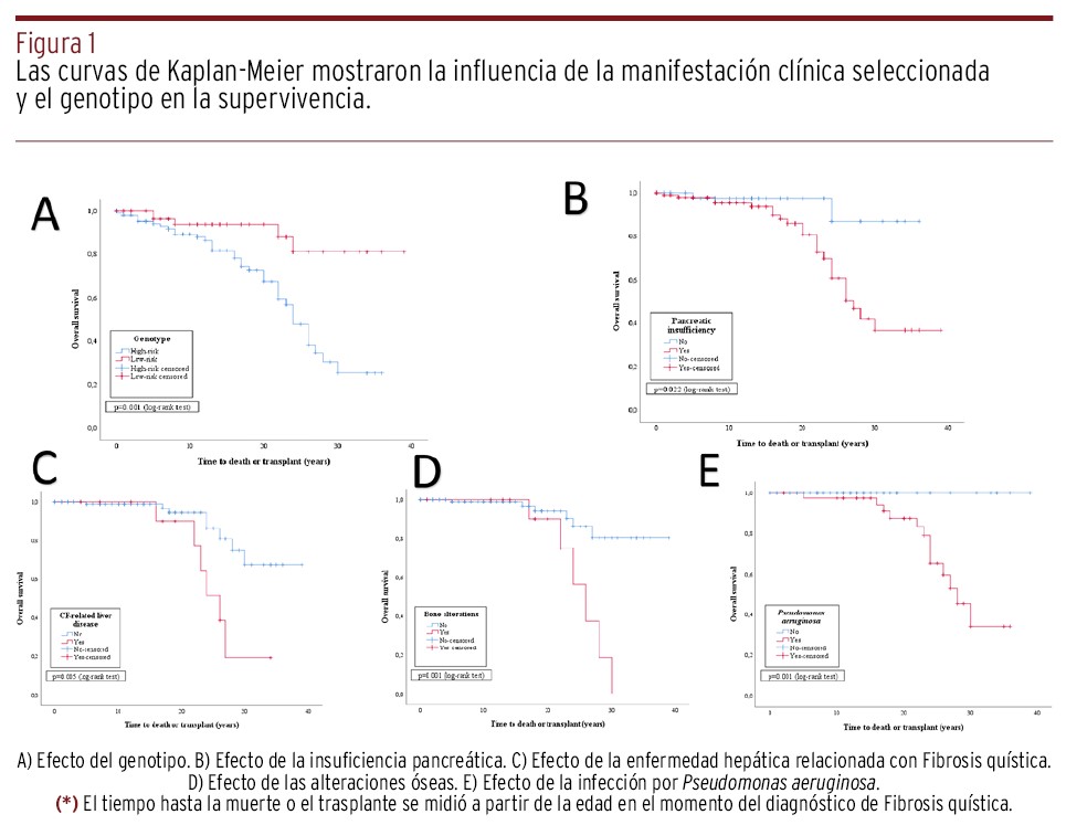 RESULTADOS // De 192 pacientes registrados en SIERrm a fecha de estudio, 39 fallecieron, siendo la mediana de edad de supervivencia de 26 años. El genotipo de alto riesgo (HR: 5,8 [IC95%: 1,97-16,94]), la insuficiencia pancreática (HR: 5,4 [IC95%: 1,24-23,48]), la colonización crónica por Pseudomonas aeruginosa (HR: 6,8 [IC95%: 1,21-38,54]), la enfermedad hepática relacionada con FQ (HR: 5,0 [IC95%: 1,61-15,61]) y las anomalías óseas (HR: 6,4 [IC95%: 1,91-21,61]) se asociaron con una disminución de la supervivencia (p<0,05). Ajustando el modelo por genotipo, se mantuvo la asociación con el genotipo de alto riesgo, la enfermedad hepática relacionada con FQ y los cambios óseos (p<0,05).