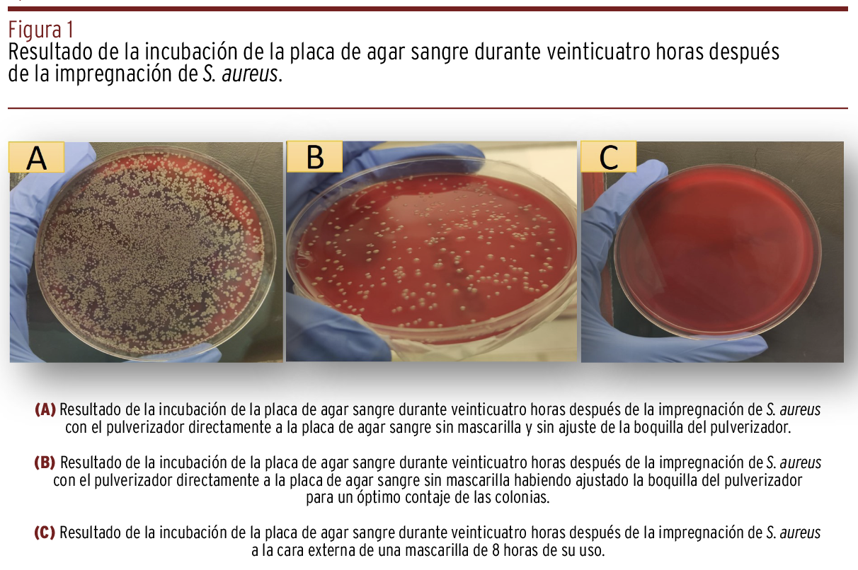 MÉTODOS // Se estudiaron 208 mascarillas quirúrgicas utilizadas durante ocho horas seguidas. Se colocaron sobre una placa de cultivo conteniendo agar sangre comercial (Agar Columbia with sheep blood plus, Thermo Scientific) y se rociaron a una distancia de treinta centímetros con una suspensión de Staphylococcus aureus (ATCC 29313). Las placas de cultivo se incubaron a 37 °C durante veinticuatro horas. Se efectuó un recuento de unidades formadoras de colonias (UFC). Como control de la EFB se incluyeron mascarillas nuevas sin utilización previa. Se utilizó una prueba T y una prueba Z al 95% de nivel de confianza para las comparaciones de las medias de los dos grupos.