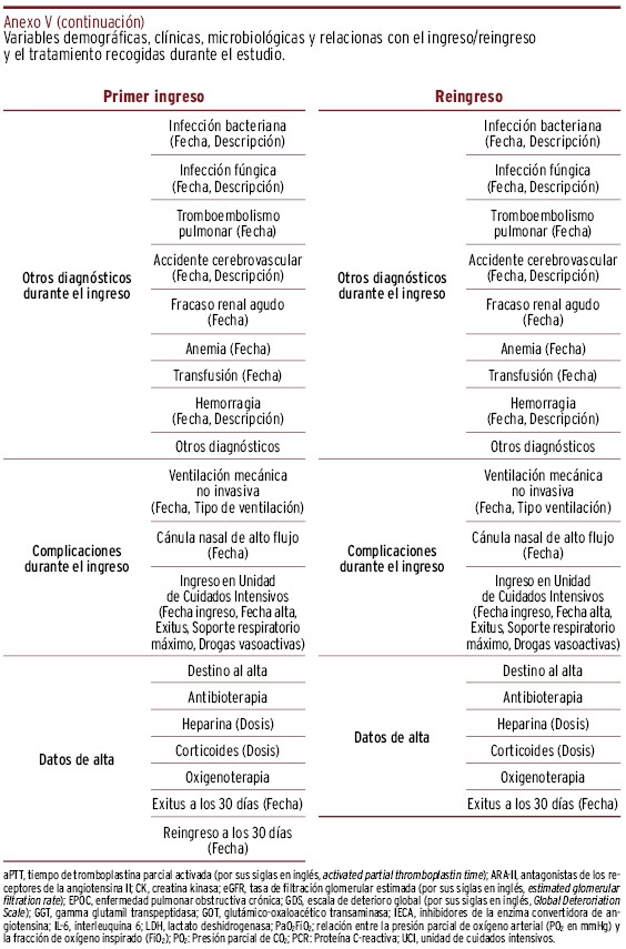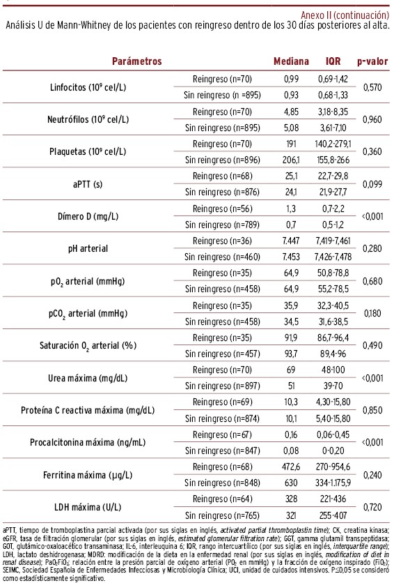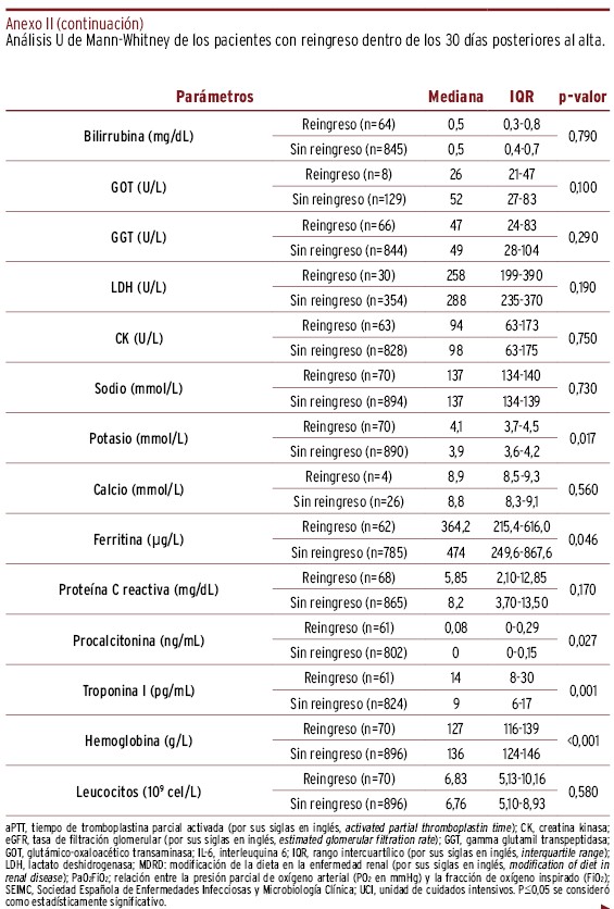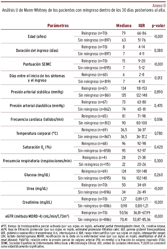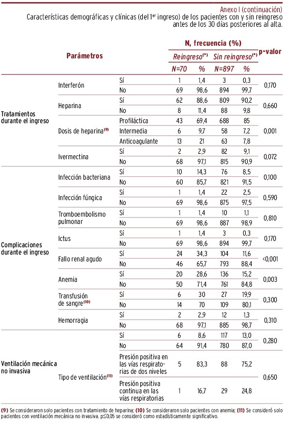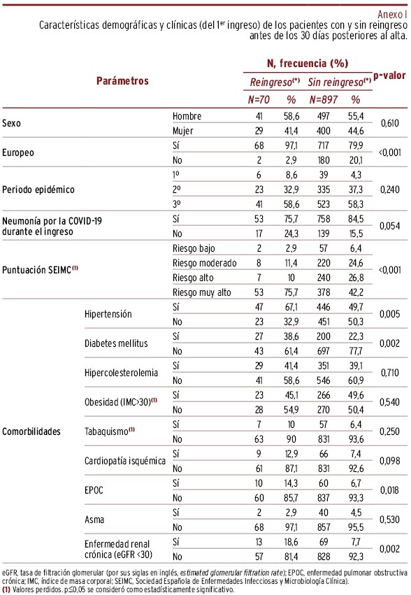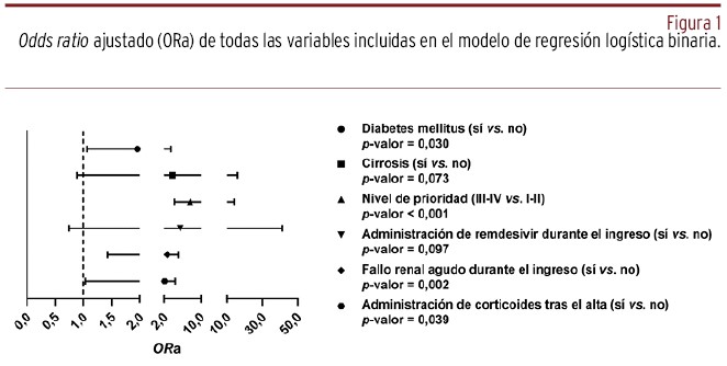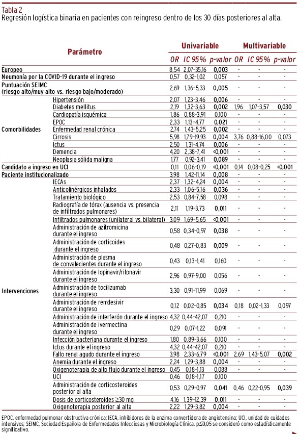 MÉTODOS // Se realizó un estudio sobre una cohorte que describía las características de los pacientes adultos reingresados en los treinta días siguientes al alta tras un ingreso por la COVID-19. Se analizaron los factores de riesgo asociados a reingreso mediante un modelo de regresión de logística binaria.