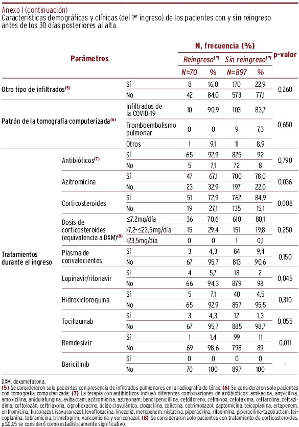 CONCLUSIONES // Una proporción sustancial de los pacientes ingresados por la COVID-19 reingresan, con una elevada letalidad. La diabetes mellitus, la insuficiencia renal aguda, no ser candidato a ingreso en UCI y no tener prescritos corticoides al alta se asocian con un mayor riesgo de reingreso.