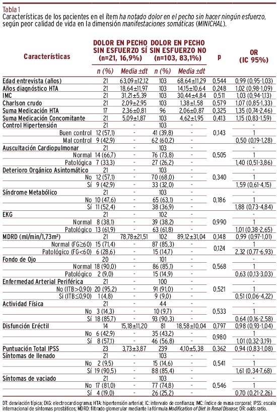 RESULTADOS // Se analizaron 262 hipertensos, de los cuales el 42% refirió peor calidad de vida en la dimensión estado mental frente al 47,3% en la dimensión manifestaciones somáticas. El análisis de regresión logística multivariada mostró como variables predictoras destacadas: el Síndrome metabólico en el ítem dolor en el pecho sin hacer ningún esfuerzo; la presencia de síntomas de llenado en el ítem orinar más a menudo; la auscultación cardiopulmonar patológica en el ítem entumecimiento u hormigueo en alguna parte del cuerpo; la presencia de disfunción eréctil en el ítem dificultad para conciliar el sueño.
