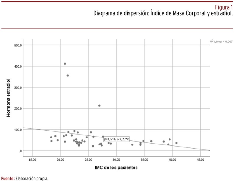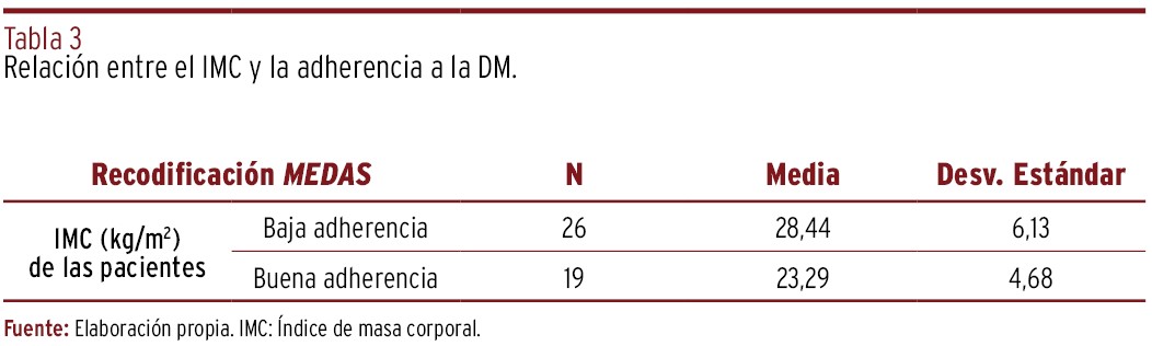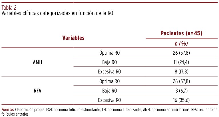RESULTADOS // El estudio incluyó una muestra total de cuarenta y cinco mujeres (n=45) siendo la media de edad de 31,84 (±3,99) años, siendo el IMC medio de 26,27 (±6,08) kg/m2, teniendo el 44,4% (n=20) un IMC por encima de los valores normales. En cuanto a la RO, se midió en base a la AMH, siendo el valor promedio de 2,32 (±1,59) ng/ml, y al RFA, siendo la media de 19,80 (±14,13) folículos antrales. Se encontró una asociación estadísticamente significativa entre la baja adherencia a la DM y menores niveles de hormona antimülleriana (AMH; p=0,025). Además, se determinó una asociación entre el bajo consumo de verduras y hortalizas (p=0,044), el excesivo consumo de carne roja (p=0,027) y de bebidas carbonatadas (p=0,015) con insuficientes niveles de AMH, indicativos de baja RO. También se observó que el bajo consumo de fruta estaba asociado con bajos niveles de estradiol (p=0,045). Asimismo, se encontraron asociaciones estadísticamente significativas que reflejaban la influencia del estado nutricional en la RO.