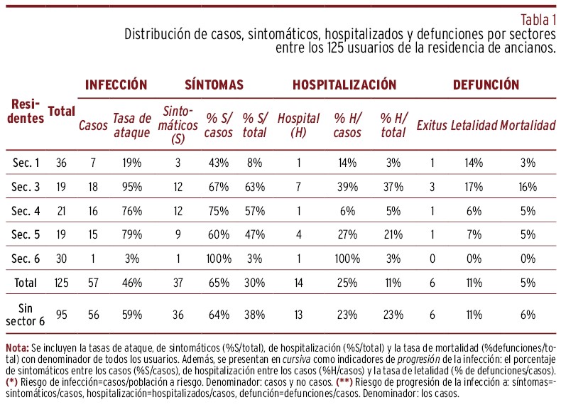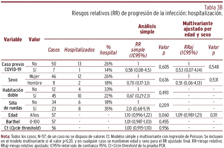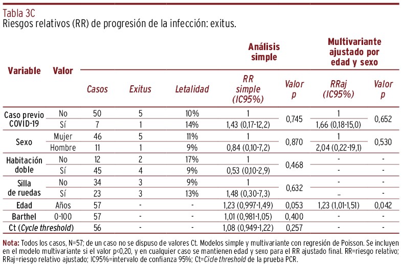 MÉTODOS // Se realizó un estudio descriptivo y de cohortes retrospectivo en la población de residentes. Se calcularon las tasas de ataque para uno de cuatro estadios de la enfermedad: infección, infección sintomática, hospitalización y defunción. Después se estimaron los riesgos relativos (RR) mediante regresión de Poisson simple y multivariante para cada uno de esos estadios.