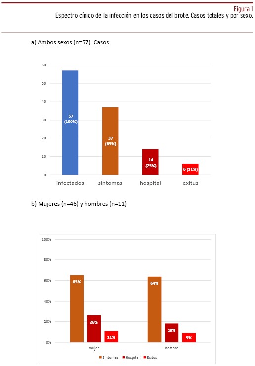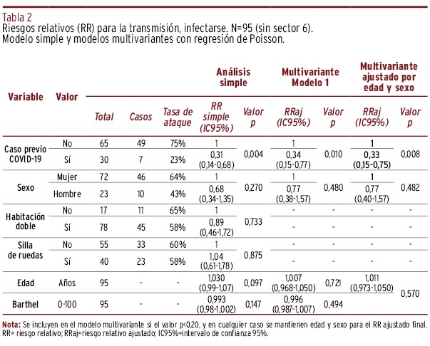 MÉTODOS // Se realizó un estudio descriptivo y de cohortes retrospectivo en la población de residentes. Se calcularon las tasas de ataque para uno de cuatro estadios de la enfermedad: infección, infección sintomática, hospitalización y defunción. Después se estimaron los riesgos relativos (RR) mediante regresión de Poisson simple y multivariante para cada uno de esos estadios.