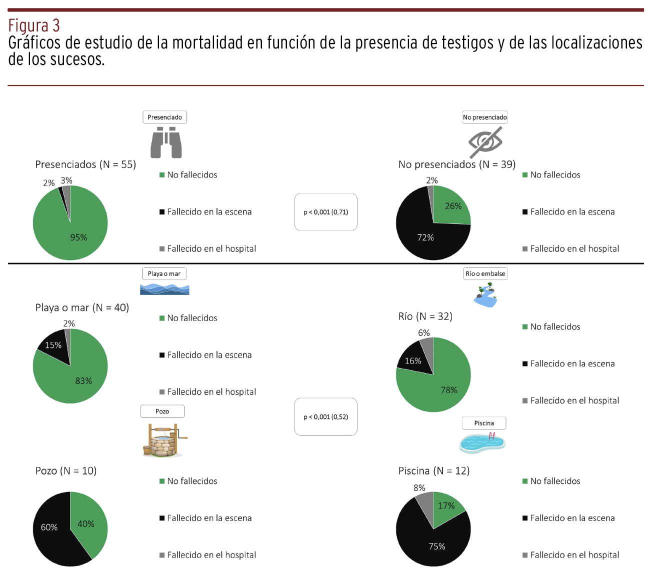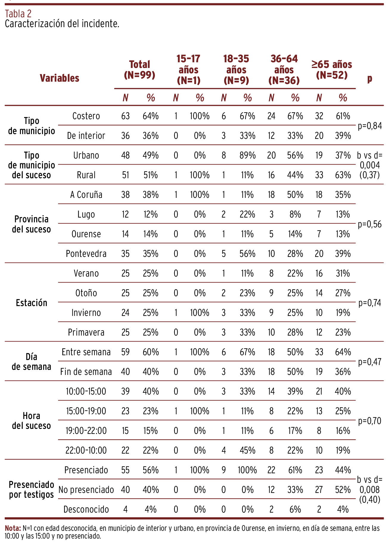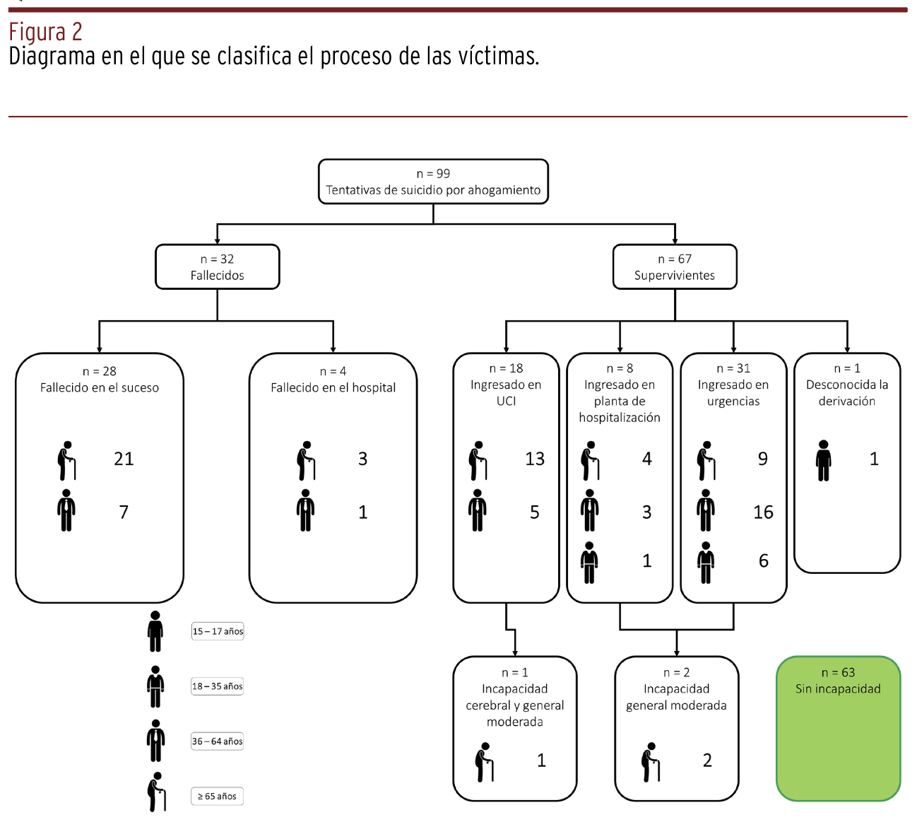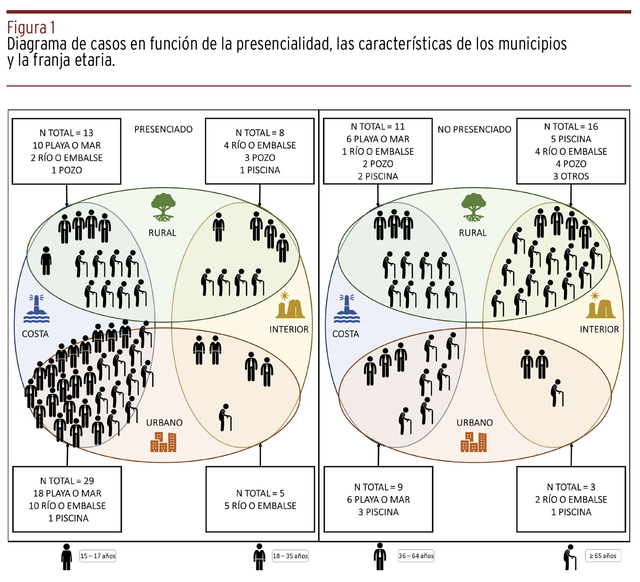 RESULTADOS // Se documentaron 99 casos, representando el 9% de todos los ahogamientos en Galicia y el 14% de las personas ahogadas mayores de sesenta y cinco años. El 82% de las víctimas eran residentes del municipio donde ocurrió el incidente y el 60% eran mujeres. El 99% tenía diagnosticado previamente algún trastorno de salud mental. Las personas mayores de sesenta y cinco años representaron el 53% de los casos, con una tasa de mortalidad del 50%. La presencia de testigos se asoció con menor mortalidad.