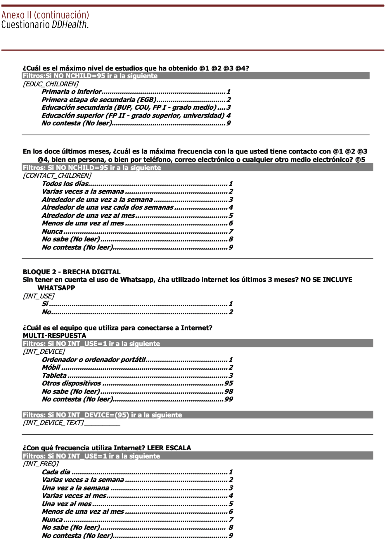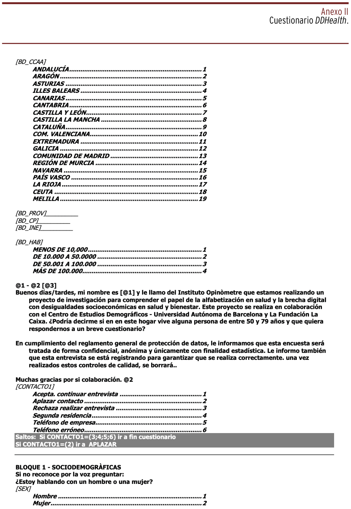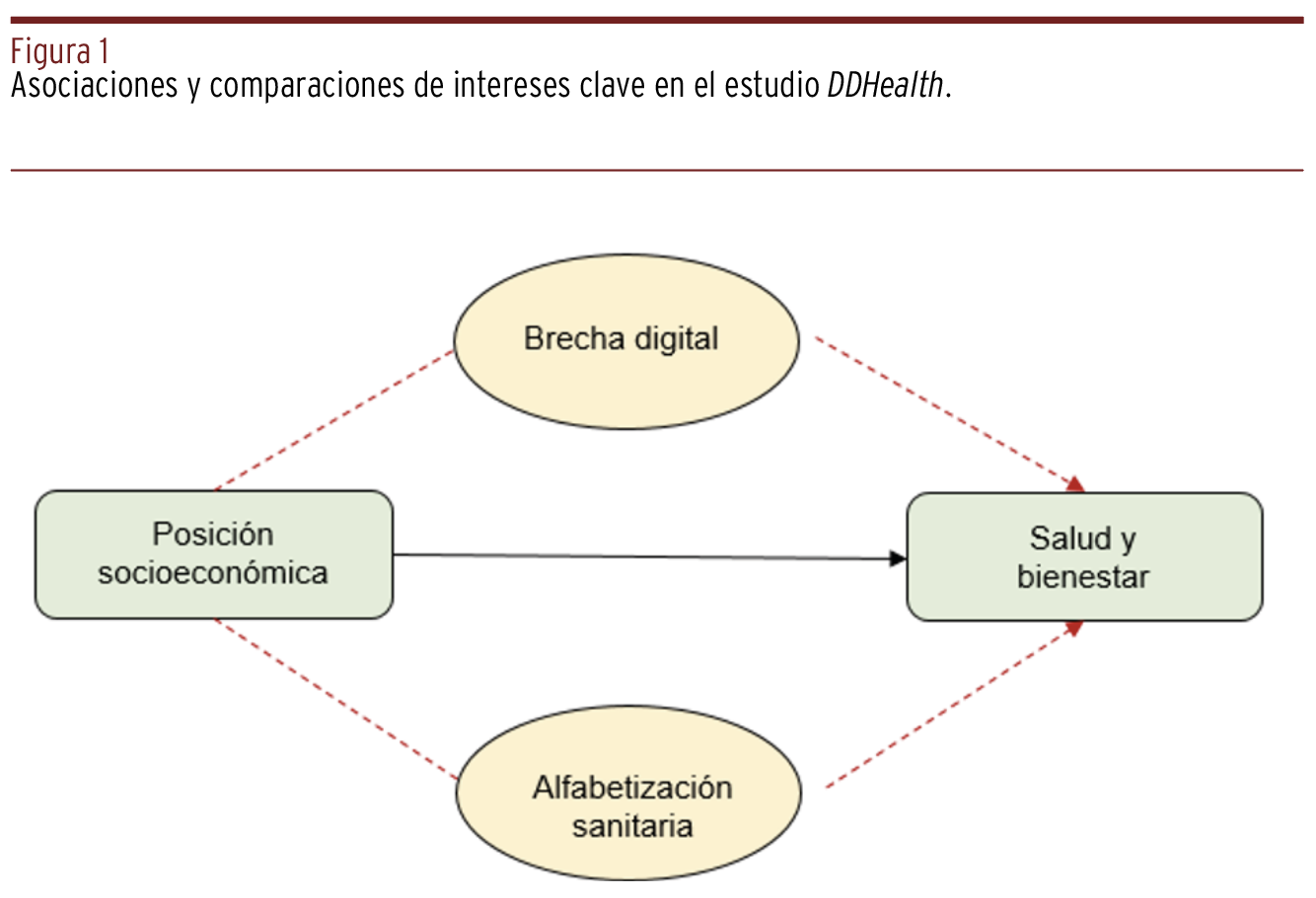 MÉTODOS // DDHealth pretende abordar dos aspectos innovadores y oportunos que se ha postulado que contribuyen a las desigualdades socioeconómicas en salud. El primero es la brecha digital socioeconómica, que se refiere a que las capacidades y posibilidades de acceder a la tecnología y usar internet son mayores entre las clases sociales altas en comparación con las bajas. La segunda es la alfabetización sanitaria, que se refiere a la capacidad de los individuos para satisfacer y comprender las complejas demandas de promoción y mantenimiento de la salud en la sociedad moderna. El estudio llevó a cabo más de 2.000 entrevistas entre residentes en España de entre cincuenta y setenta y nueve años de edad entre marzo y abril de 2022, utilizando un enfoque de entrevista telefónica asistida por ordenador (CATI). El cuestionario tiene cuatro módulos diferentes: sociodemográfico; brecha digital; salud; alfabetización sanitaria. Los datos anonimizados están disponibles a través del enlace: https://dataverse.csuc.cat/dataset.xhtml?persistentId=doi:10.34810/data765