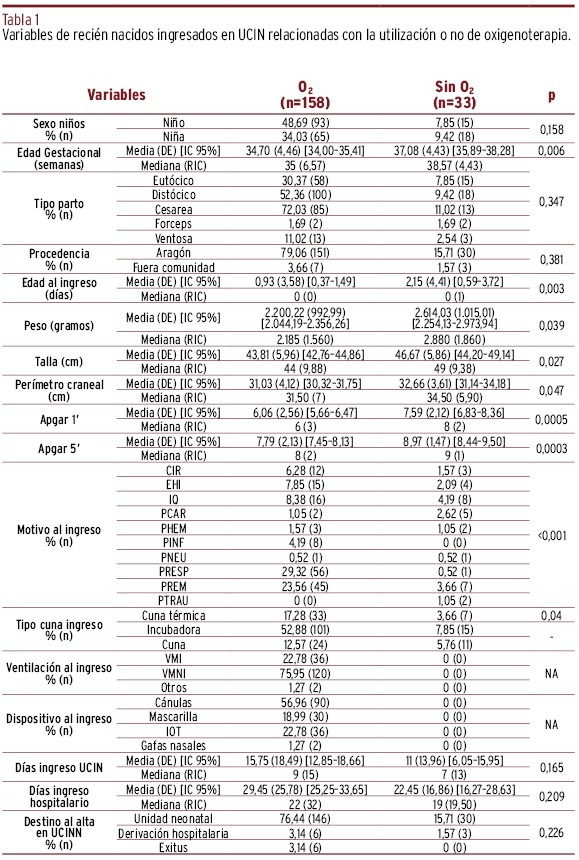 RESULTADOS // Se incluyeron 191 neonatos, de los cuales 158 (82,7%) recibieron oxigenoterapia. El 64,10% de ellos fueron niños, la media de edad fue de 5,20±8,46 días y la de peso de 1.460,0±777,57 gramos. El 24,68% presentaron LPP asociada a dispositivo, con una media de días de ingreso en el momento de la aparición de 3,98±5,03 días. El 94,74% de las lesiones fueron de grado I y el 84,62% se localizaron en tabique nasal.