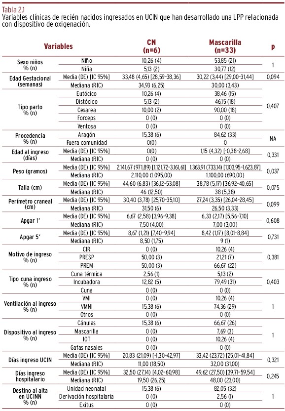 MÉTODOS // Se realizó un estudio retrospectivo, observacional y analítico de neonatos hospitalizados que desarrollaran una LPP secundaria a dispositivos de O2 en la UCIN del Hospital Universitario Miguel Servet de Zaragoza. Las variables registradas fueron las sociodemográficas, las clínicas, el tipo de cuna, la humedad, la temperatura, el tipo de oxigenoterapia, el tipo de ventilación, el dispositivo utilizado, la presencia de úlcera (número, grado, localización) y las medidas preventivas aplicadas. El estudio fue aprobado por el Comité de Ética de la Investigación de la Comunidad Autónoma de Aragón. El análisis estadístico se realizó mediante Jamovi 2.3.13®.