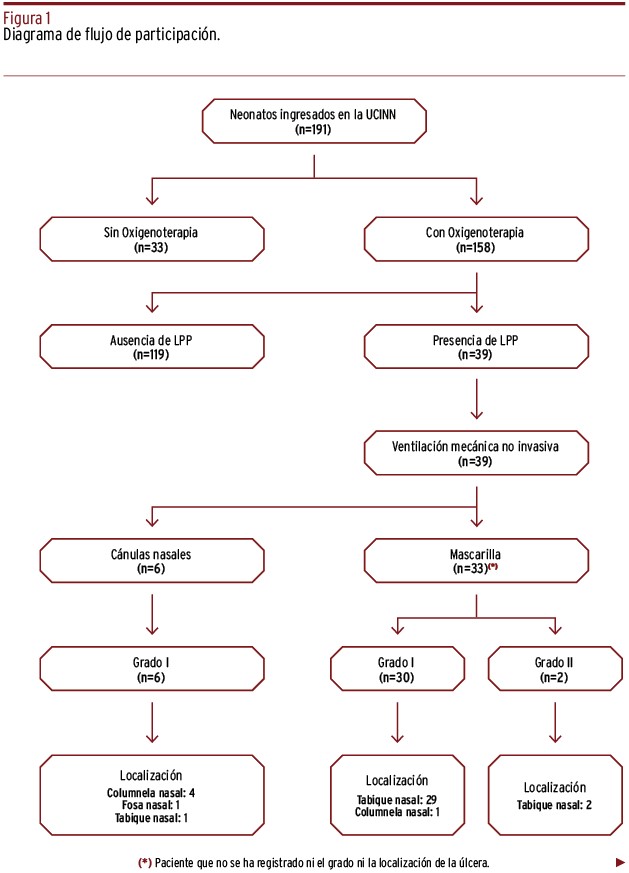 RESULTADOS // Se incluyeron 191 neonatos, de los cuales 158 (82,7%) recibieron oxigenoterapia. El 64,10% de ellos fueron niños, la media de edad fue de 5,20±8,46 días y la de peso de 1.460,0±777,57 gramos. El 24,68% presentaron LPP asociada a dispositivo, con una media de días de ingreso en el momento de la aparición de 3,98±5,03 días. El 94,74% de las lesiones fueron de grado I y el 84,62% se localizaron en tabique nasal.