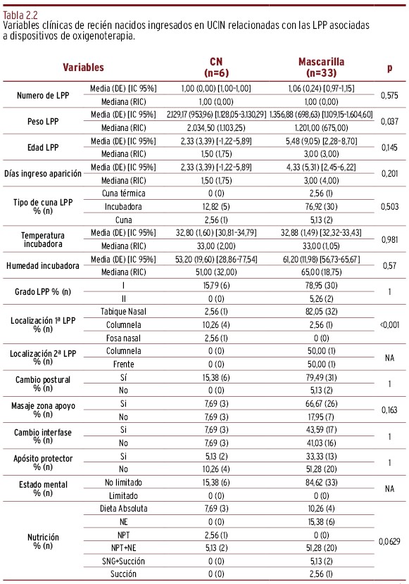 MÉTODOS // Se realizó un estudio retrospectivo, observacional y analítico de neonatos hospitalizados que desarrollaran una LPP secundaria a dispositivos de O2 en la UCIN del Hospital Universitario Miguel Servet de Zaragoza. Las variables registradas fueron las sociodemográficas, las clínicas, el tipo de cuna, la humedad, la temperatura, el tipo de oxigenoterapia, el tipo de ventilación, el dispositivo utilizado, la presencia de úlcera (número, grado, localización) y las medidas preventivas aplicadas. El estudio fue aprobado por el Comité de Ética de la Investigación de la Comunidad Autónoma de Aragón. El análisis estadístico se realizó mediante Jamovi 2.3.13®.